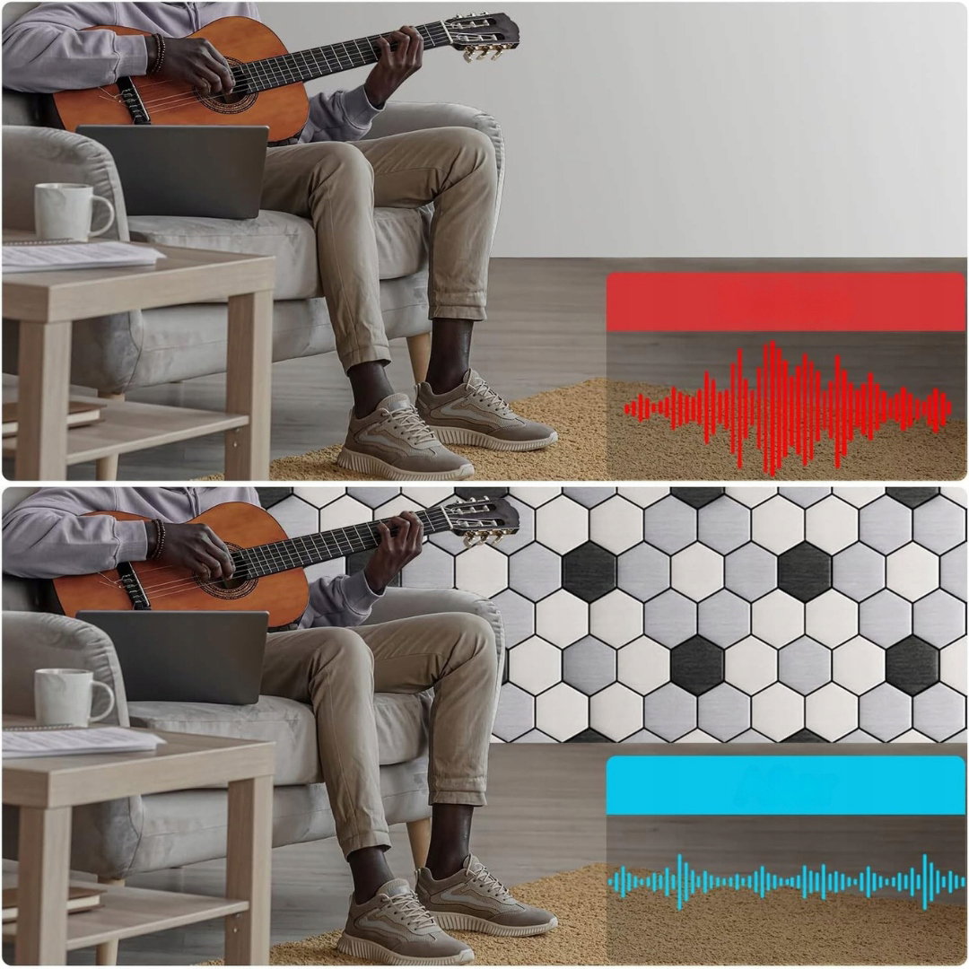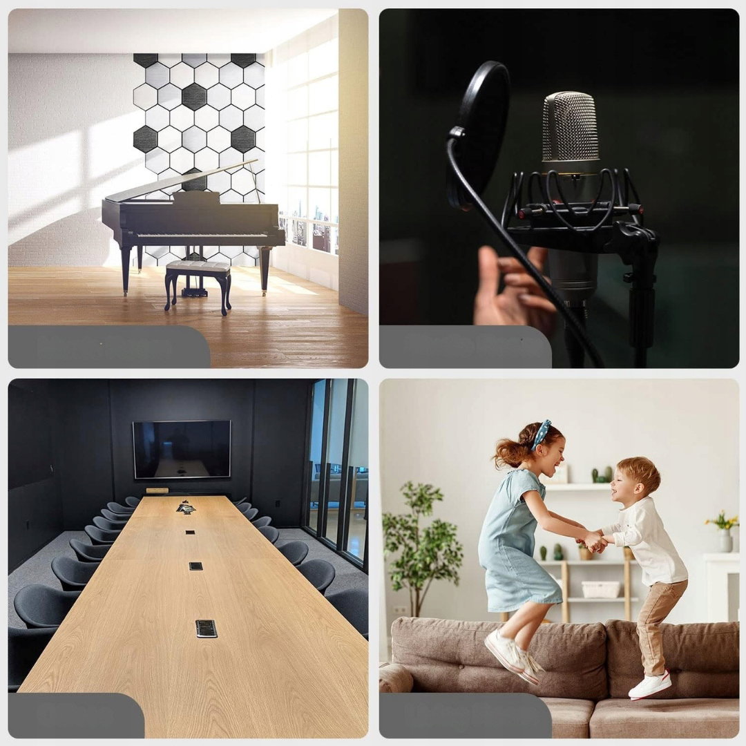 - Łatwy montaż: ulepszony model paneli dźwiękochłonnych posiada warstwę samoprzylepną, dzięki czemu nie wymaga użycia kleju ani taśmy dwustronnej. Wystarczy odkleić folię ochronną i przykleić panel do ściany — szybko i czysto.
