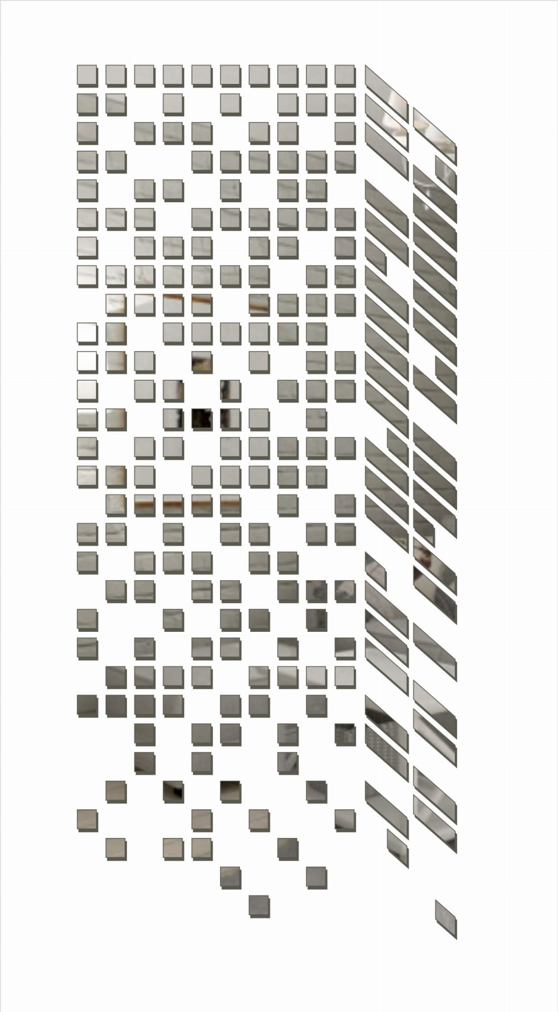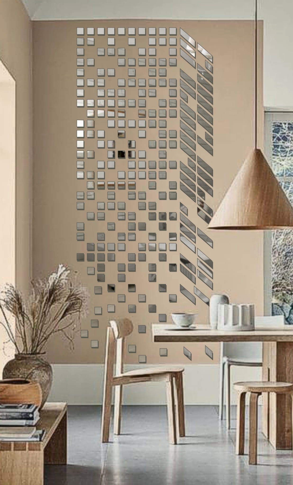 Kompozycja składa się z małych, lustrzanych modułów ułożonych w formę smukłego, geometrycznego wieżowca. Dzięki temu dekoracja uzyskuje efekt 3D i przyciąga uwagę już od progu.