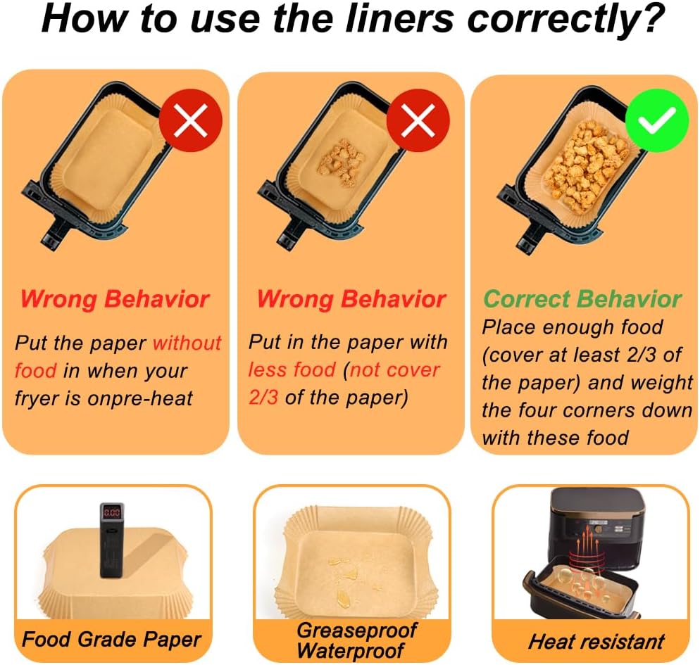 ODPORNOŚĆ NA CIEPŁE I ŁATWE W UŻYCIU: Bezpieczne na ciepło do 450 stopni F (232℃), Można używać w kuchence mikrofalowej i piekarniku. Te nieprzywierające jednorazowe arkusze frytkownicy powietrznej mają kształt miski i dokładny rozmiar, nie wymagają cięcia ani składania. Wystarczy włożyć wkładki do kosza, a po użyciu wyrzucić do kosza na śmieci. W porównaniu z silikonową wkładką do frytkownicy powietrznej, wkładki z papieru pergaminowego są wygodniejsze