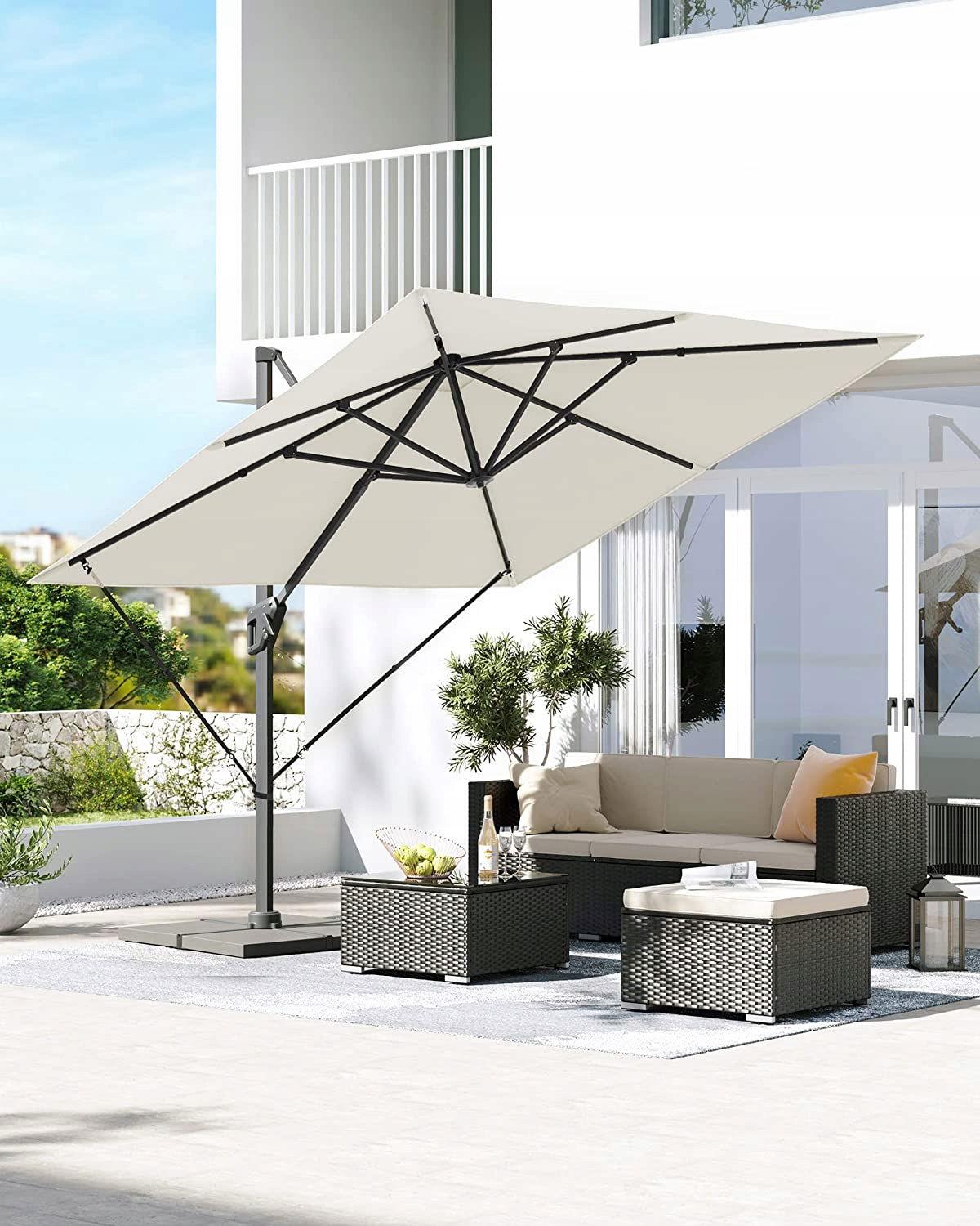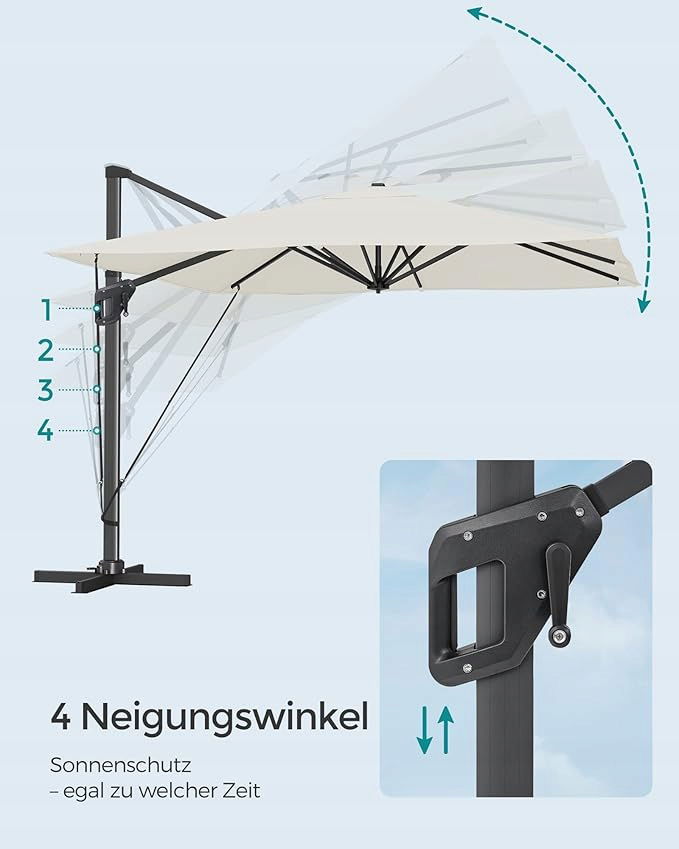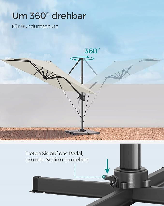 Elastyczna regulacja: Parasol można obracać o 360° za pomocą pedału nożnego i można go regulować pod 4 różnymi kątami nachylenia. Dostosuj go do odpowiedniej pory dnia, aby cieszyć się ochroną przeciwsłoneczną przez cały dzień