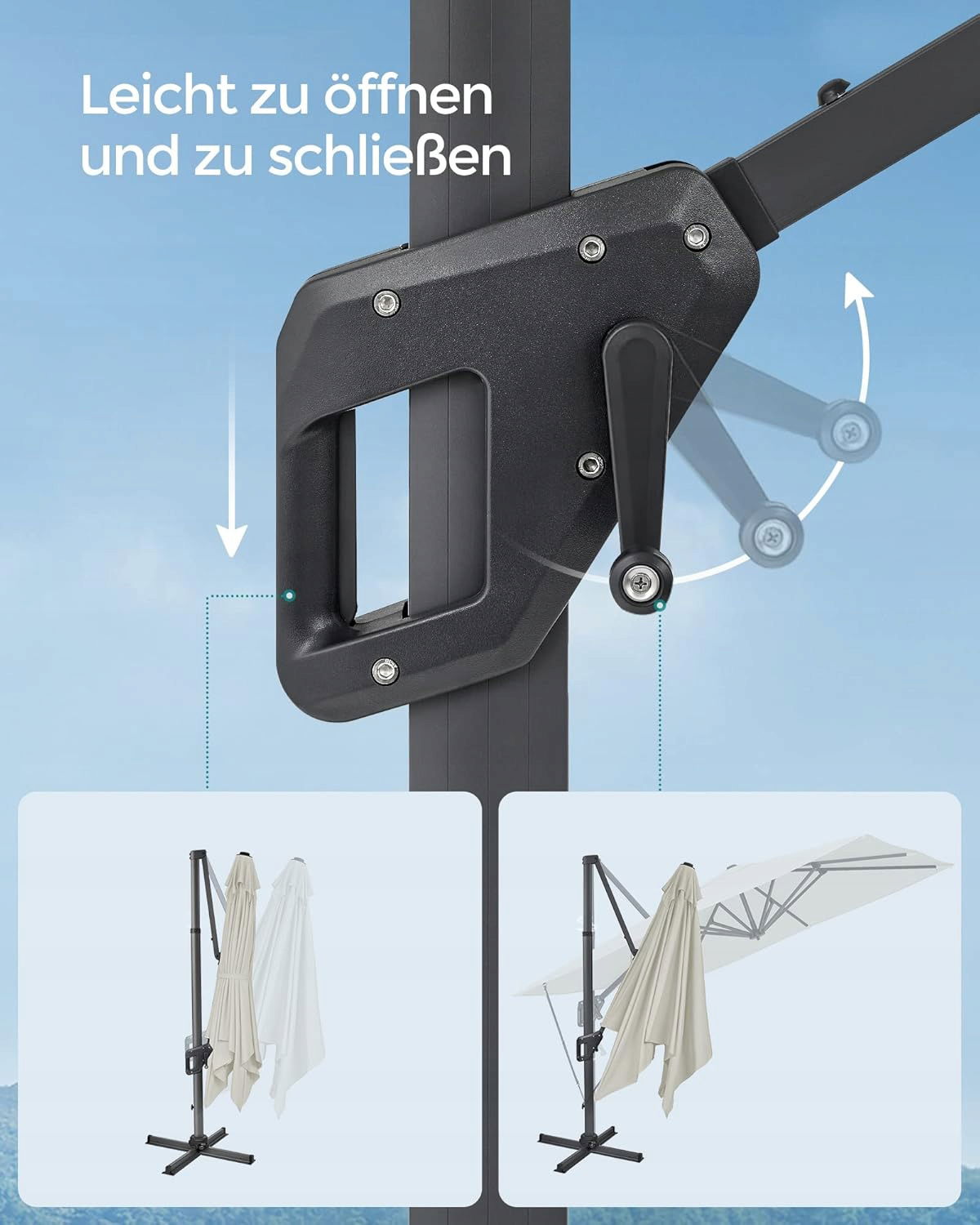 [Łatwy w otwieraniu i zamykaniu] Wystarczy przekręcić korbę, aby otworzyć i zamknąć ten parasol ogrodowy. Szybko i łatwo!