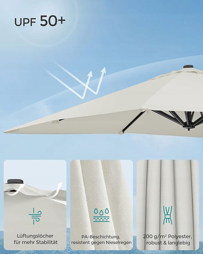 Ochrona przed słońcem i mżawką: Parasol wykonany z poliestru o gramaturze 200 g/m² zapewnia optymalną ochronę przed promieniowaniem UV (UPF 50+) i blokuje ponad 98% promieni UV. Dzięki powłoce PA jest wodoodporny i odporny na mżawkę