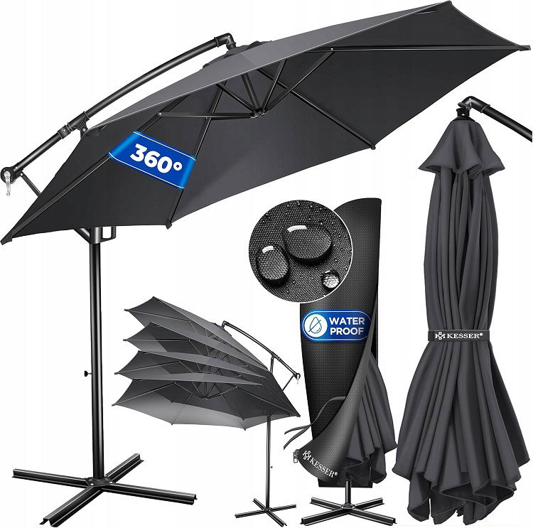 Lato już tuż-tuż, niebo jest bezchmurne , a temperatury szybko rosną . Chcesz cieszyć się pogodą, ale nie narażać się na niepotrzebne promieniowanie UV . Dzięki parasolowi wysięgnikowemu KESSER ochronisz siebie i swoich gości przed bezpośrednim promieniowaniem UV , a jednocześnie stworzysz zacienione miejsce na balkonie, tarasie lub w ogrodzie . Weź chłodny napój , dobrą książkę i ciesz się dniem beztrosko w naszym wspaniałym cieniu . Solidny maszt wykonany z lekkiego i odpornego na rdzę aluminium o średnicy 48 mm gwarantuje stabilne podparcie , a 6 rozpórek gwarantuje dodatkową stabilność . Dodatkowo, podstawę parasola można obciążyć za pomocą pasującego stojaka KESSER, aby był odporny na wiatr i warunki atmosferyczne . Pokrowiec parasola wykonany jest w 100% z poliestru i jest wodoodporny , dzięki czemu możesz używać parasola nawet podczas deszczu . Dzięki zintegrowanemu systemowi korbowemu możesz łatwo otwierać i zamykać parasol za pomocą płynnie działającej ręcznej wciągarki . Możesz w kilka sekund rozstawić swój parasol i cieszyć się latem – kręcąc nim zamiast dźwigać ciężary . Parasol ogrodowy można płynnie regulować pod różnymi kątami za pomocą dźwigni blokującej . Wystarczy otworzyć dźwignię , ustawić żądany kąt i ponownie ją zamknąć . Dzięki temu można indywidualnie dopasować parasol do położenia słońca . Dzięki pochylonemu zawieszeniu ten parasol ogrodowy unosi się swobodnie i można go obracać o 360°, pomimo zamocowania na stałe stojaka .