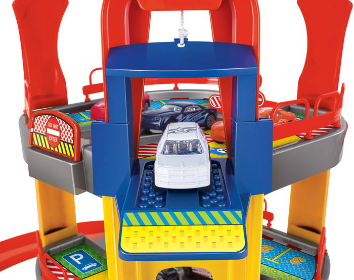 Wielopoziomowy parking oferuje szereg atrakcji: spiralna rampa zjazdowa, podnośnik do naprawy samochodów, winda, a także stacja paliw zapewniają dziecku wiele godzin ekscytującej zabawy. Każdy, nawet najbardziej wymagający mały kierowca, znajdzie coś dla siebie w tym zestawie. Dodatkowo, kolorowe samochodziki, które są częścią kompletu, stają się doskonałym dodatkiem, który z pewnością uatrakcyjni każdą zabawę