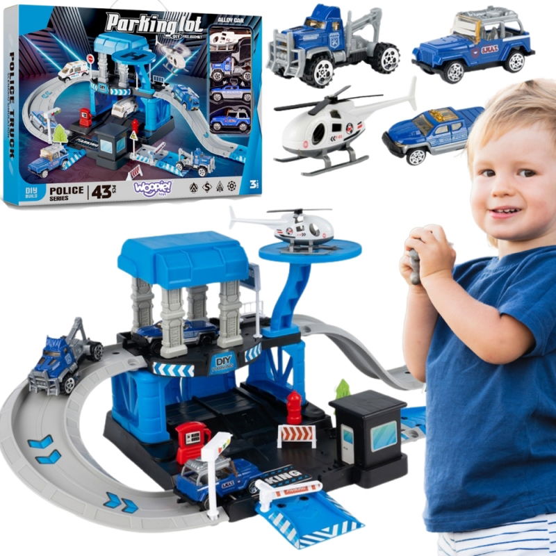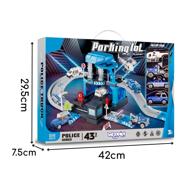 Fantastyczny zestaw tematyczny marki Woopie - Parking policyjny z akcesoriami i pojazdami! To idealna zabawka dla małych miłośników motoryzacji i służb mundurowych. Dwupoziomowy parking z rampami, lądowiskiem dla helikoptera i bogatą ilością detali zapewnią długie godziny kreatywnej zabawy. W zestawie aż 43 elementy, w tym metalowe auta policyjne i helikopter, które pozwolą na odgrywanie różnorodnych scenariuszy. Solidna konstrukcja z wytrzymałego plastiku zapewnia bezpieczną zabawę. Zabawka rozwija wyobraźnię, koordynację ruchową, logiczne myślenie oraz umiejętność rozpoznawania ról społecznych. Wymiary produktu: 52 x 30 x 18 cm, wymiary opakowania: 42 x 7.5 x 29.5 cm. Ten zestaw to doskonała propozycja dla małych policjantów w herbatkę!