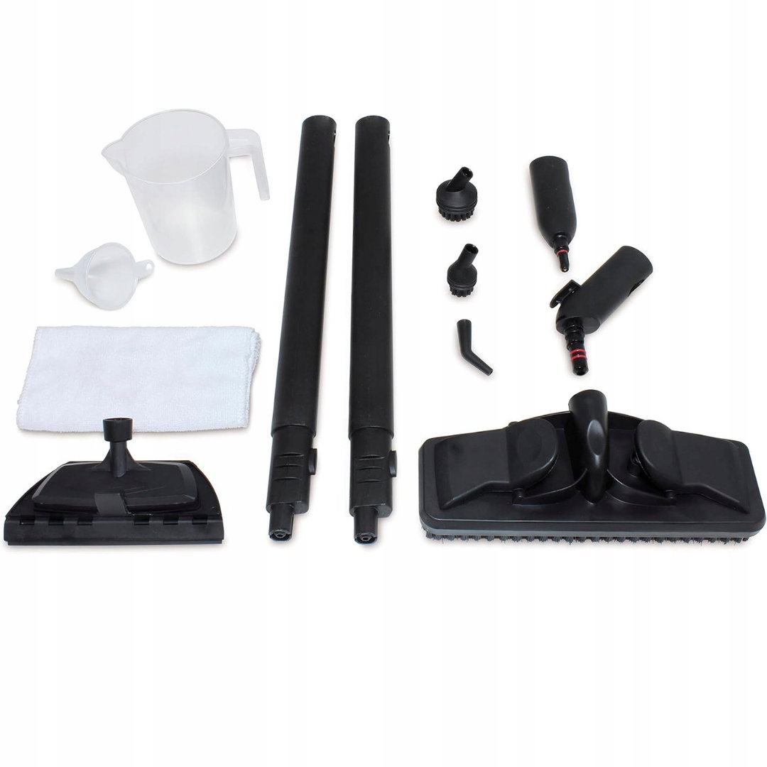 - Zawartość zestawu: parowy czyścik, dysza do podłóg, ściereczka, dysza 2 w 1 do szyb, 2 okrągłe szczotki, 2 rury przedłużające, dysza punktowa, miarka i lejek.
