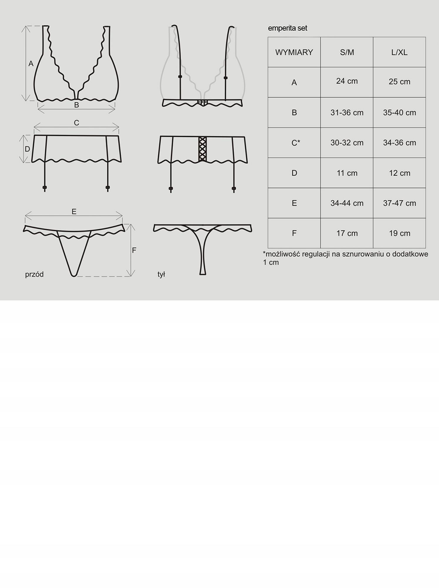 3 części - kuszący stanik, pikantny pas do pończoch oraz stringi. Wszystkie elementy kompletu z gustowną, kwiatową aplikacją i koronkowym wykończeniem!