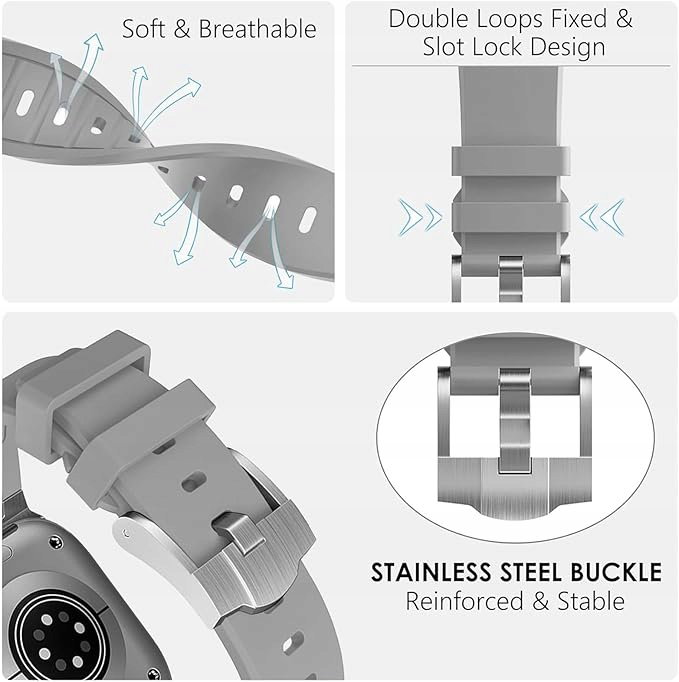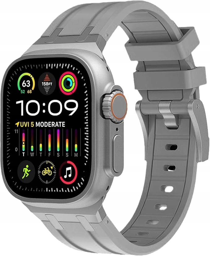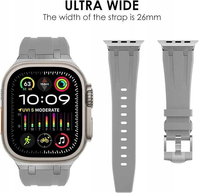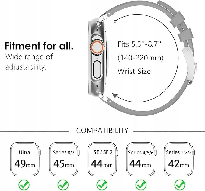 Kompatybilne modele: Paski sportowe z płynnej gumy do zegarka Apple Watch są kompatybilne z modelami Apple Watch Ultra/Ultra 2 49 mm, Apple Watch Series 8 Series 7 45 mm, Apple Watc Series 6/5/4/SE 44 mm, Apple Watc Series 3/2/1 42 mm. Pasuje do nadgarstków o obwodzie od 140 do 220 mm.