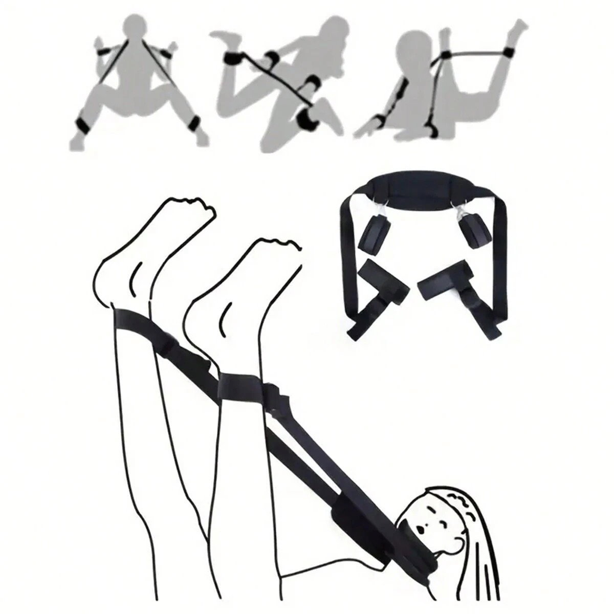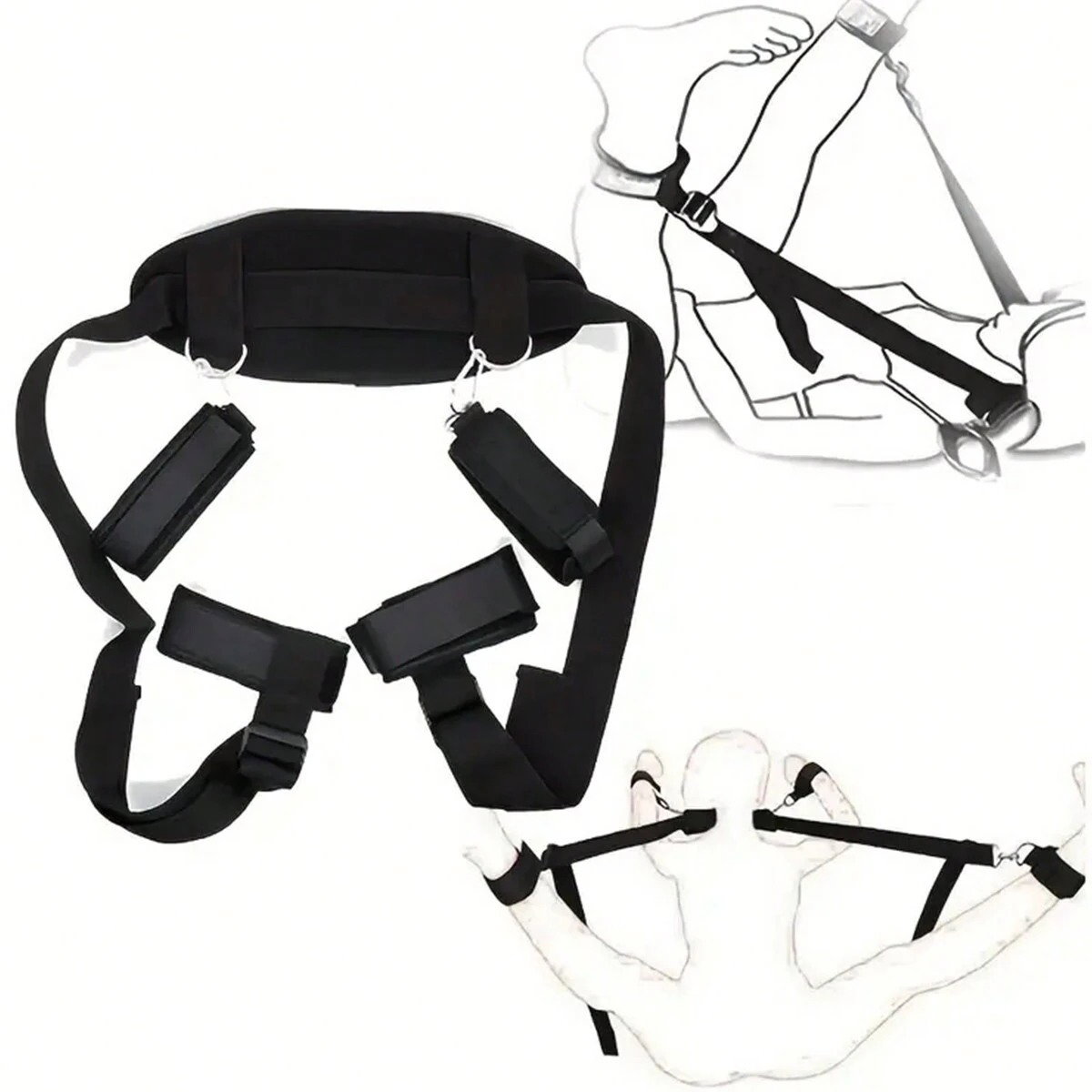 Zestaw zawiera pasy z karabińczykami na końcach do mocowania, oraz kajdanki na nogi i nadgarstki. Pasy umieszcza się pod materacem i paskiem łączącym łączy ze sobą.