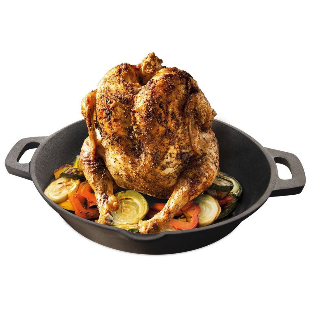PRAKTYCZNA - Patelnia żeliwna ze stojakiem przeznaczona do pieczenia drobiu, szczególnie kurczaka. Umożliwia równomierne grillowanie kurczaka ze wszystkich stron. Patelnia ma średnicę 28 cm i wymiary całkowite: 35 x 30 x 9 cm.