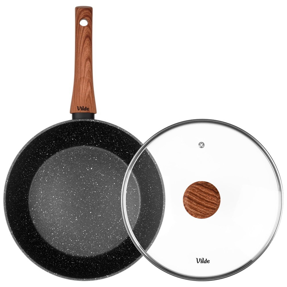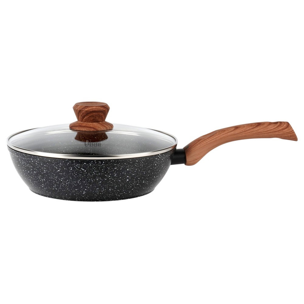 GRANITOWA POWŁOKA I ŻAROODPORNA POKRYWKA - Patelnia wykonana jest z odlewu aluminium z nieprzywierającą powłoką granitową, co umożliwia smażenie i duszenie na minimalnej ilości tłuszczu. Pokrywka jest z żaroodpornego szkła, a jej obręcz wykonano ze stali nierdzewnej. Uchwyt patelni i pokrywki są typu soft touch wykonane z tworzywa w brązowym kolorze, ze wzorem imitującym drewno.
