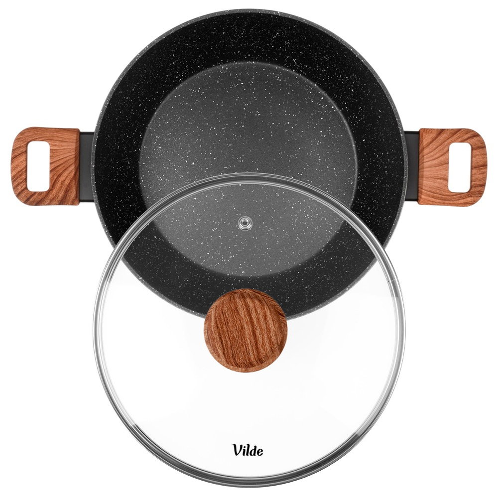 GRANITOWA POWŁOKA I ŻAROODPORNA POKRYWKA - Patelnia wykonana jest z odlewu aluminium z nieprzywierającą powłoką granitową, co umożliwia smażenie i duszenie na minimalnej ilości tłuszczu. Pokrywka jest z żaroodpornego szkła, a jej obręcz wykonano ze stali nierdzewnej. Uchwyty patelni i pokrywki są typu soft touch wykonane z tworzywa w brązowym kolorze, ze wzorem imitującym drewno.