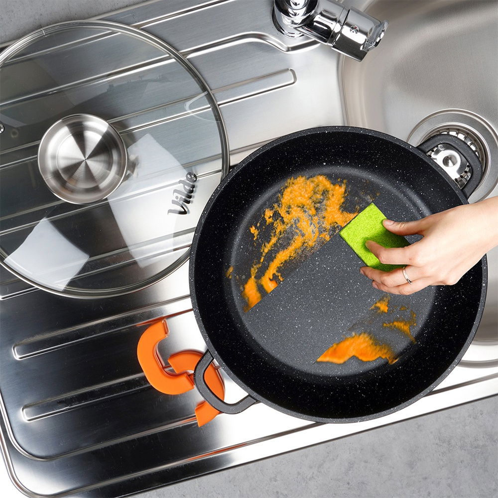 Granitowa powłoka i żaroodporna pokrywka - Patelnia wykonana jest z odlewu aluminium z nieprzywierającą powłoką granitową, co umożliwia smażenie i duszenie na minimalnej ilości tłuszczu. Pokrywka jest żaroodporna, a jej uchwyt wykonano ze stali nierdzewnej. W zestawie znajdują się praktyczne silikonowe nakładki w pomarańczowym kolorze.