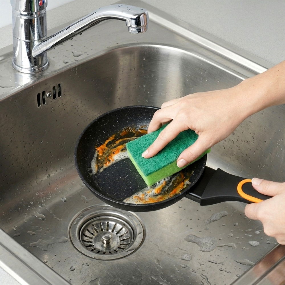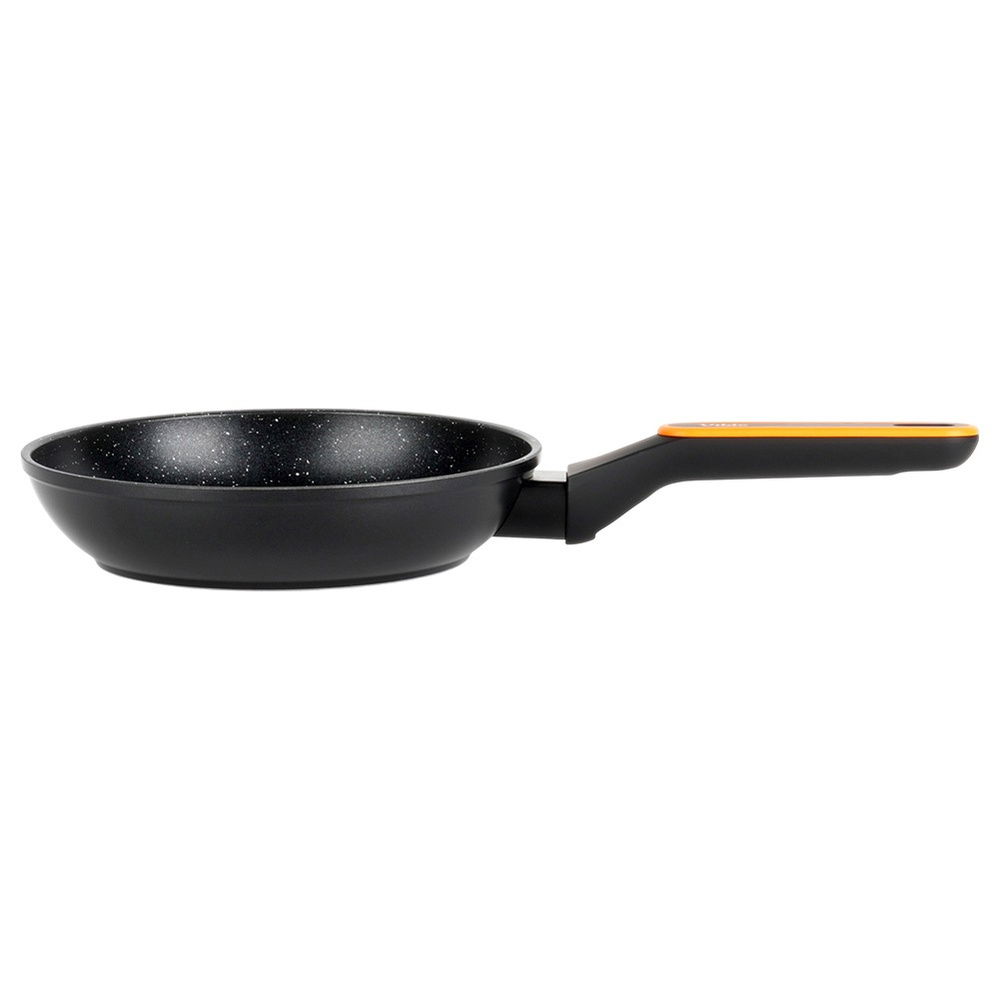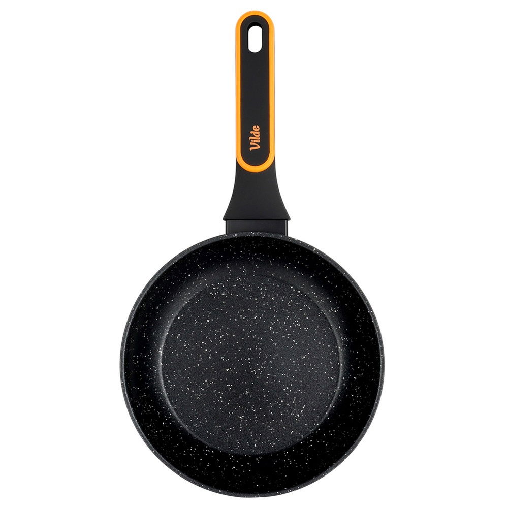 Nieprzywierająca powłoka granitowa - Patelnia wykonana z aluminium z nieprzywierającą powłoką granitową w czarnym kolorze. Powierzchnia nieprzywierająca umożliwia przygotowywanie zdrowych i smacznych posiłków z minimalną ilością tłuszczu. Wyposażona w uchwyt wykonany z najwyższej jakości, wytrzymałego tworzywa w czarnym i pomarańczowym kolorze.