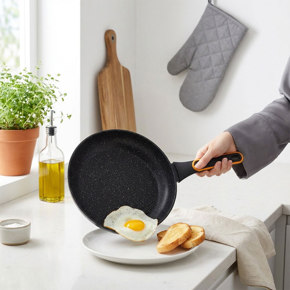 Nieprzywierająca powłoka granitowa - Patelnia wykonana z aluminium z nieprzywierającą powłoką granitową w czarnym kolorze. Powierzchnia nieprzywierająca umożliwia przygotowywanie zdrowych i smacznych posiłków z minimalną ilością tłuszczu. Wyposażona w uchwyt wykonany z najwyższej jakości, wytrzymałego tworzywa w czarnym i pomarańczowym kolorze.