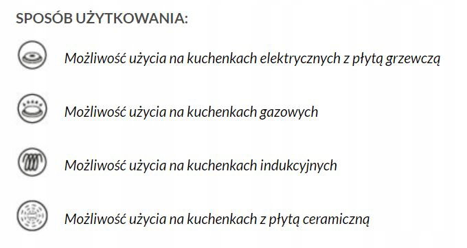 Możliwość używania na kuchni ceramicznej, Możliwość używania na kuchni elektrycznej, Możliwość używania na kuchni gazowej, możliwość używania na kuchni indukcyjnej, nienagrzewające się uchwyty