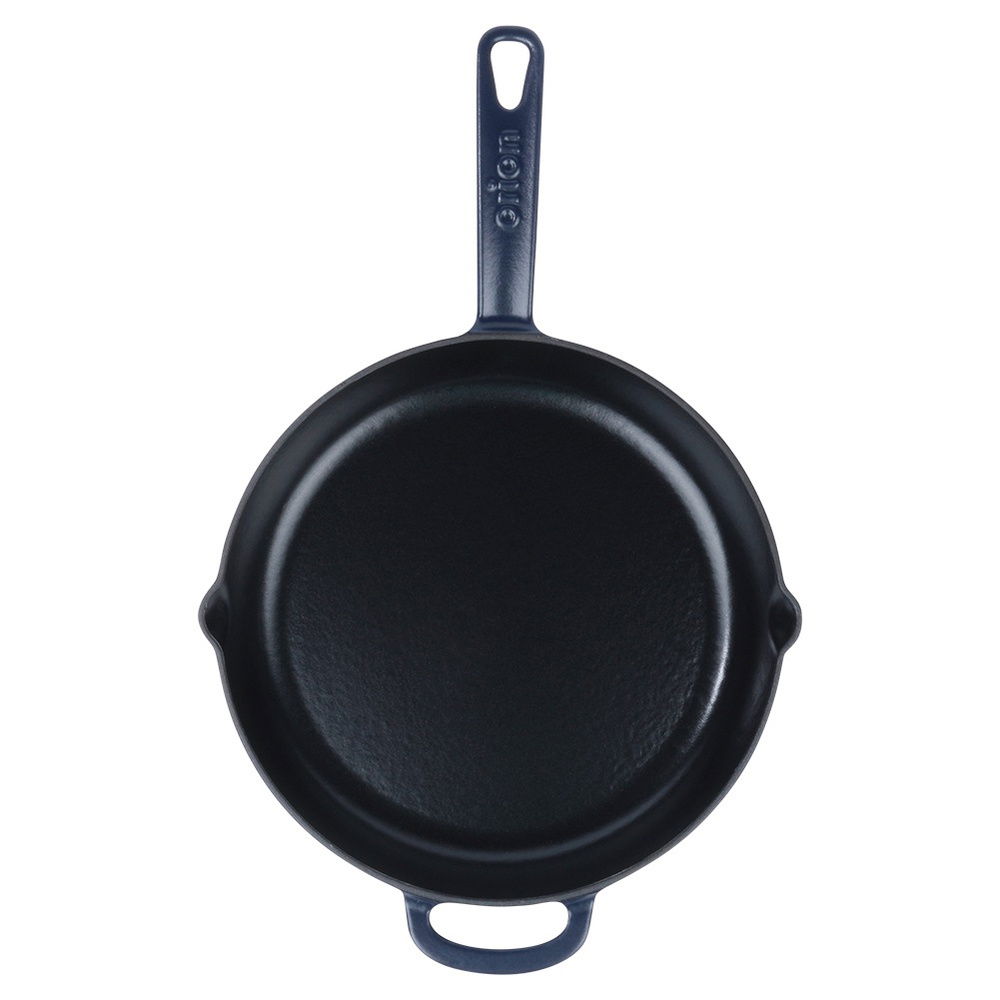 Żeliwna z powłoką emaliowaną - Patelnia wykonana z odlewu żeliwa z emaliowaną powłoką w kolorze czarnym. Zewnętrzna część patelni i rączka w kolorze granatowym. Emaliowana powłoka ułatwi smażenie i serwowanie dań, a także zapewni wygodne czyszczenie. Naczynia wykonane z żeliwa idealnie rozprowadzają ciepło oraz długo utrzymują wysoką temperaturę. Patelnia jest solidna, masywna, długowieczna.