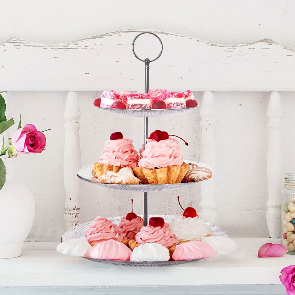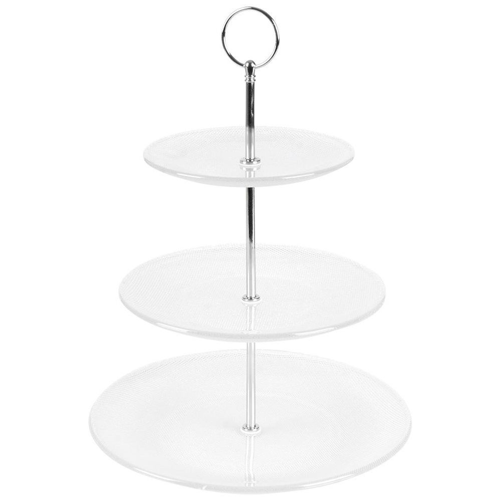 Trzypiętrowa patera do serwowania oraz ekspozycji. Świetnie prezentować się będą na niej babeczki, ciasteczka, różnego rodzaju desery jak również przystawki. Idealnie sprawdzi się do przygotowania słodkich stołów, dzięki niej w efektowny sposób wyeksponujemy na stole słodkości oraz słone przekąski. Sprawdzi się do użytku domowego oraz profesjonalnego.
