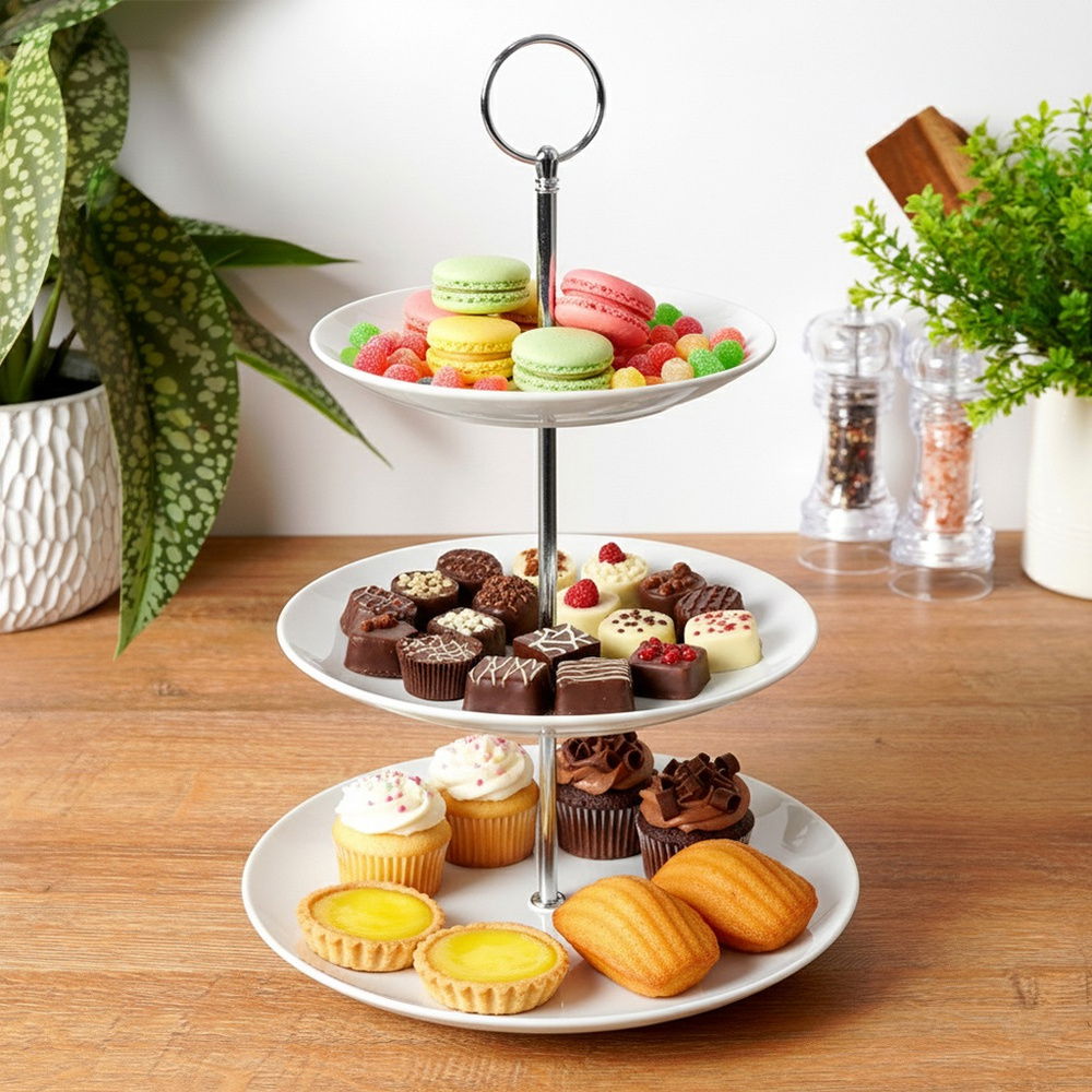 3-piętrowa dla wygody przechowywania - Wyposażona w trzy tace o różnych średnicach. Taca duża o średnicy 25 cm, taca średnia o średnicy 20 cm oraz mała taca o średnicy 15 cm.
