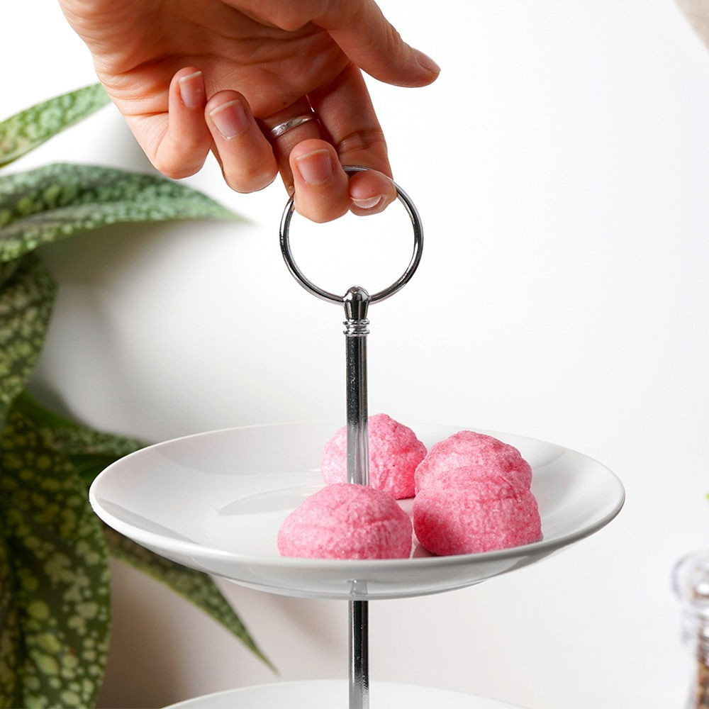 Wykonana z porcelany - Wykonana z najwyższej jakości porcelany w białym kolorze, a część mocująca i uchwyt wykonane z metalu w kolorze srebrnym. Patera jest solidna i stabilna.