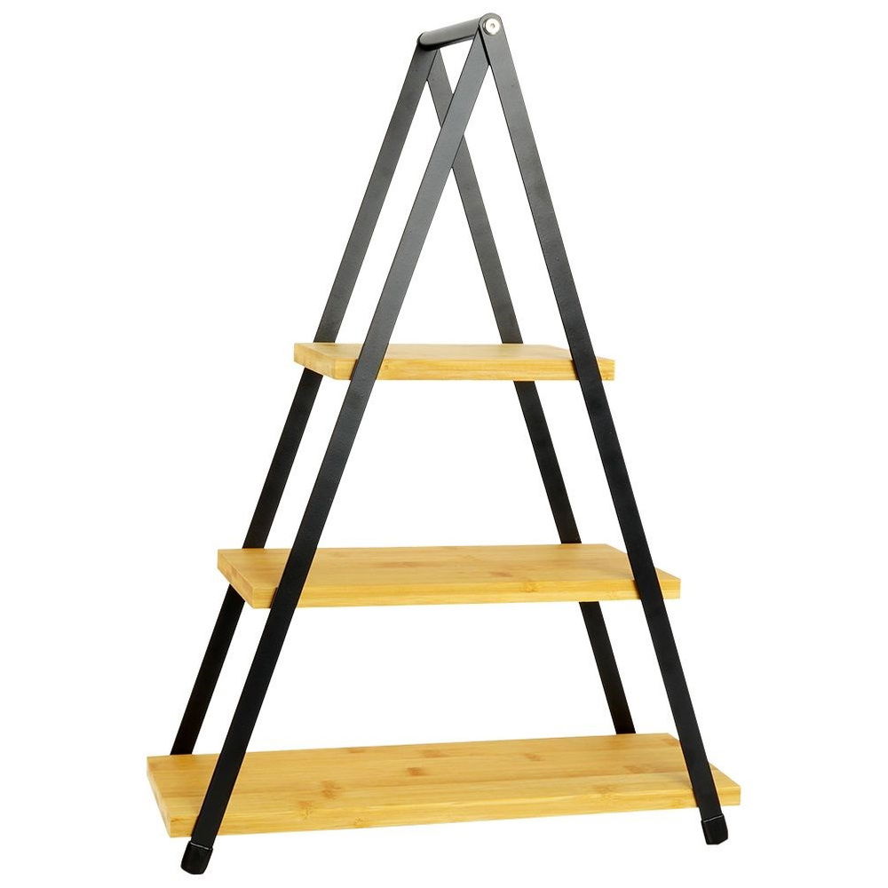 SOLIDNA - Konstrukcja została wykonana z metalu w czarnym kolorze. Poziomy pater zostały wykonane z drewna bambusowego. Usadowiona na czterech nóżkach, które są antypoślizgowe.