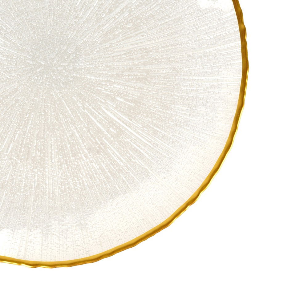 Wykonana ze szkła posiada zdobienia - Wykonana z najwyższej jakości szkła malowanego na perłowy, biały kolor ze złotym rantem. Odpowiednio użytkowana posłuży długie lata.