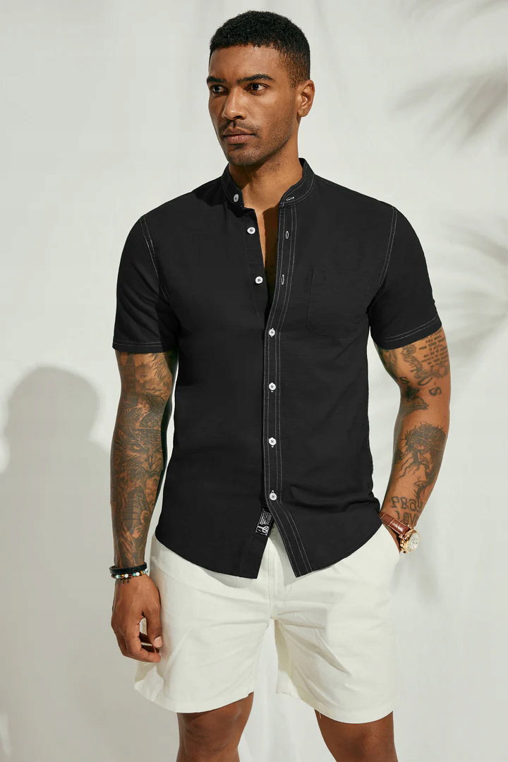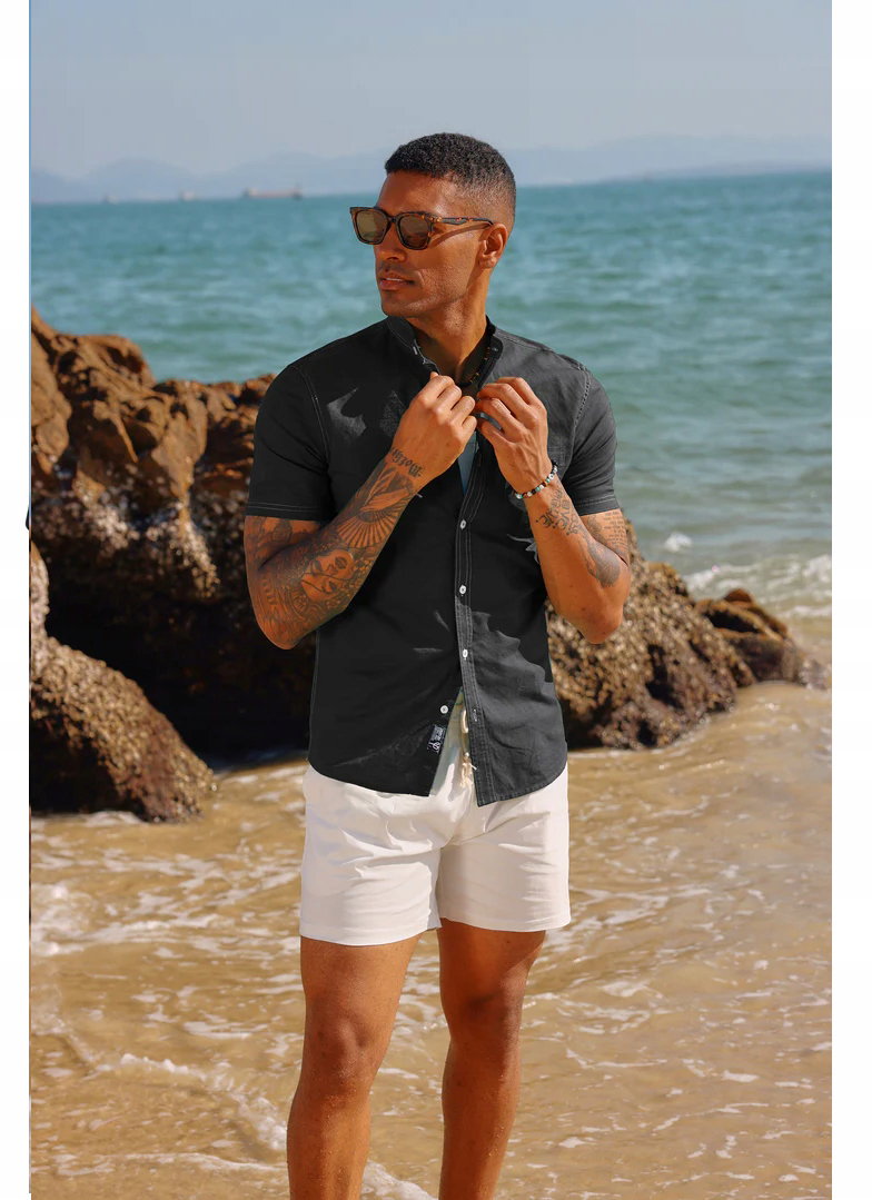 Koszula lniana Paul Jones męska z krótkim rękawem, letnia, koszule plażowe, koszula z kołnierzykiem typu stójka zapinana na guziki,