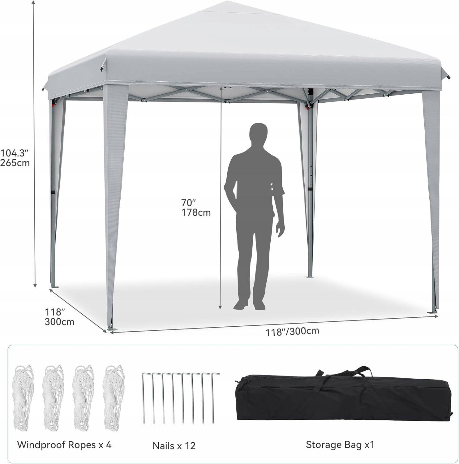 - akres dostawy: 1 x 3 x 3 m pawilon typu pop-up do użytku na zewnątrz i pasujące akcesoria, takie jak 1 x torba do przenoszenia, 4 x linka i 8 x śledzie. Zapewnia to bezproblemową instalację bez konieczności stosowania czegoś innego. Torba 420D Oxford jest dostarczana z kółkami, aby ułatwić transport.