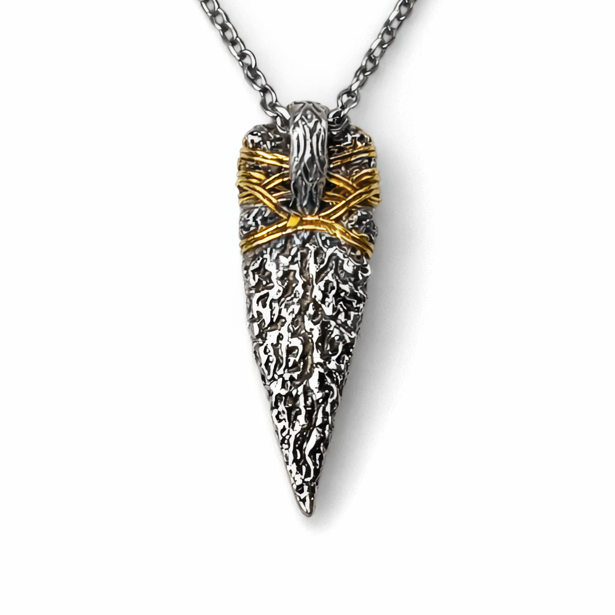 Każdy element – od agresywnie zwężającego się czubka po teksturowaną, „połamaną” powierzchnię – wzmacnia narrację o brutalności i prastarej męce. Materiał zawieszki to wytrzymały metal bazowy, fachowo platerowany i wykończony, aby uzyskać warstwowe, patynowane i lśniące powierzchnie. Noś ten uderzający element jako odważny, bezkompromisowy symbol swojego przywiązania do najmroczniejszych zakątków gry: namacalny fragment brutalnego piękna Elden Ring, noszony blisko serca.