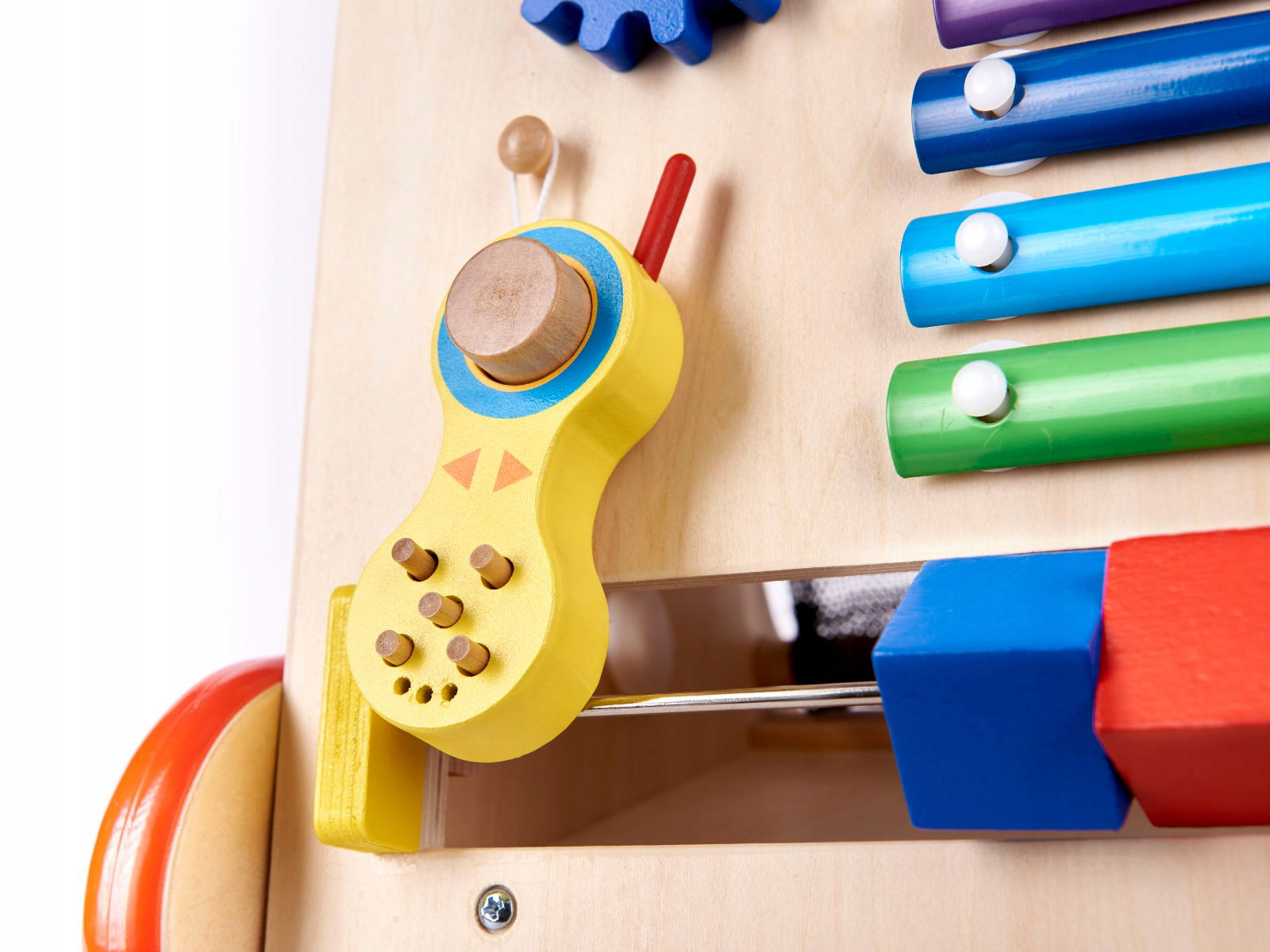 Kolorowe elementy przyciagają wzrok i małe rączki kolorami. Jednocześnie, dzięki neutralnej, drewnianej bazie, zabawka nie dostarcza dziecku nadmiaru bodźców.