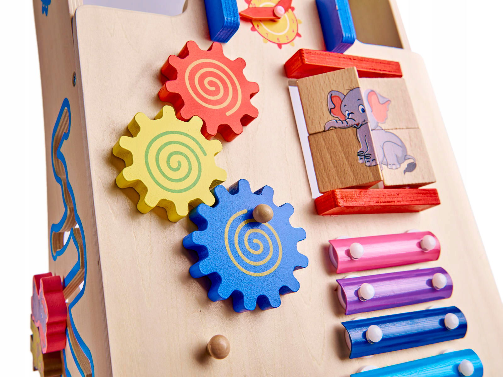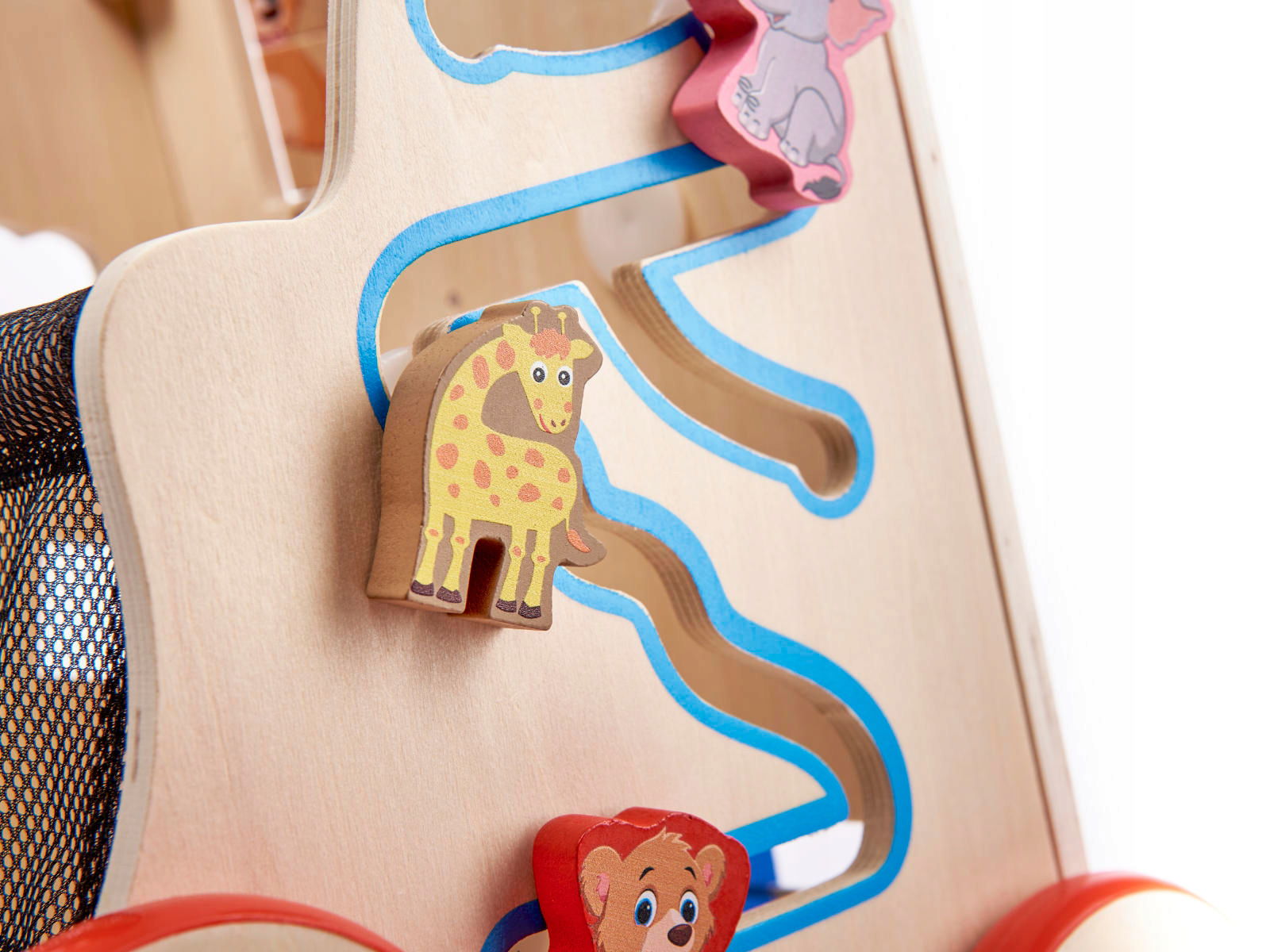 To nie tylko chodzik! Twórcy zadbali, by dostarczył on maluchom rozrywki na wiele sposobów. Z przodu pchacza umieszczono tablicę manipulacyjną pełną elementów, które zachwycą dzieci: