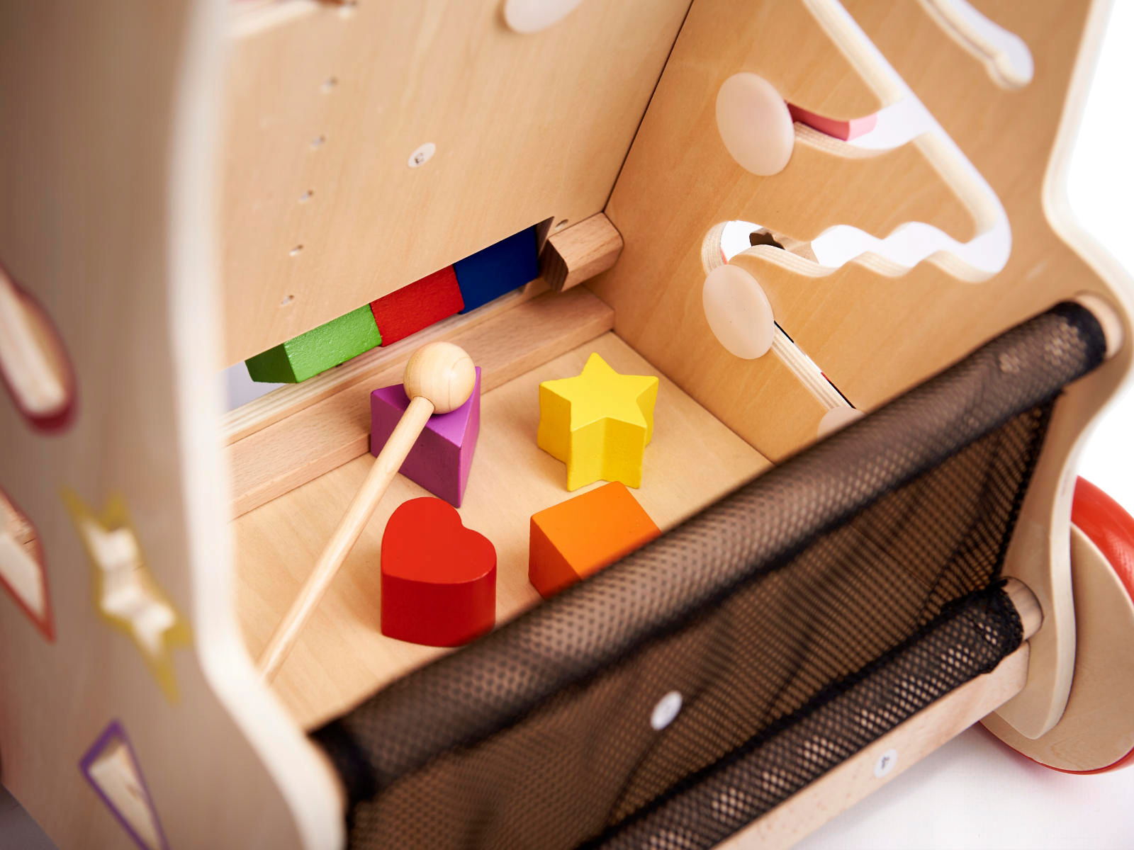 Podstawa chodzika to jednocześnie skrzynia, do której wpadną klocki z sortera. Można w niej przechować i przewozić pałeczkę do cymbałków oraz wiele innych zabawek. Skrzynię zabezpieczono siatką.