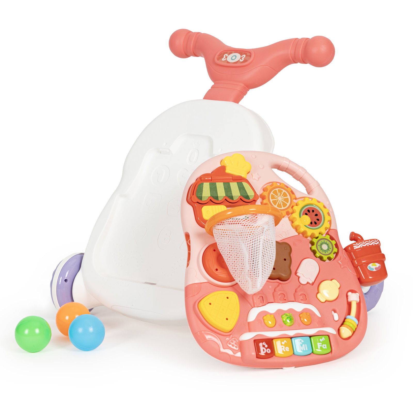 Dzięki przemyślanej konstrukcji, zabawka może służyć jako pchacz lub stolik edukacyjny.