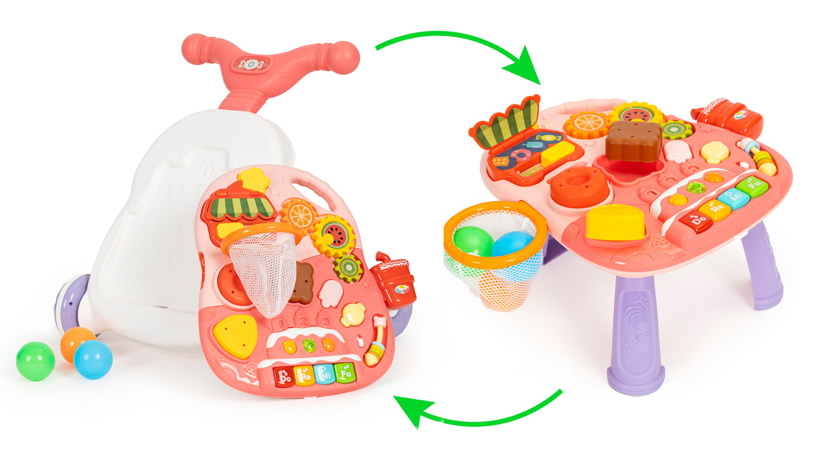 • Opcja 2w1: pchacz, stolik edukacyjny