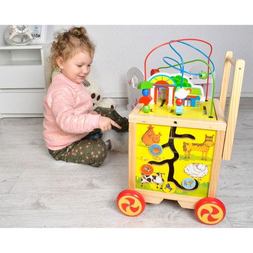 Zabawka pchacz z kostką edukacyjną pozytywnie wpływa na rozwój dziecka, a równocześnie dostarcza dużą dawkę uśmiechu i dobrej zabawy. Dziecko pcha zabawkę przed sobą i uczy się stawiać pierwsze kroki oraz doskonalić zdobytą umiejętność. Dzięki specjalnie zaprojektowanej interaktywnej kostce dziecko rozwija się w wielu różnych dziedzinach.