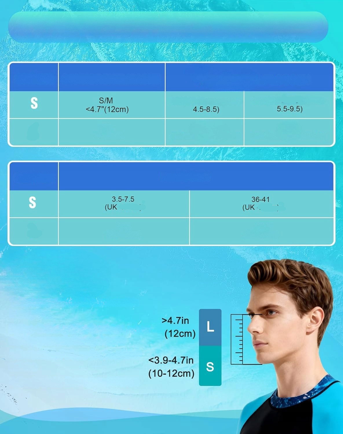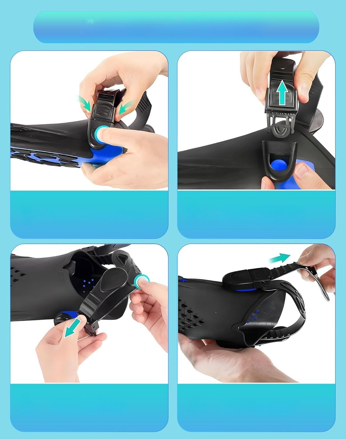 - Regulowane płetwy w zestawie: dołączone płetwy z regulowaną, otwartą piętą dopasowują się do różnych rozmiarów stóp, co umożliwia wygodne użytkowanie przez różnych użytkowników. Antypoślizgowa podeszwa zwiększa bezpieczeństwo na mokrych i śliskich powierzchniach, a elastyczna konstrukcja ułatwia zakładanie i zdejmowanie.