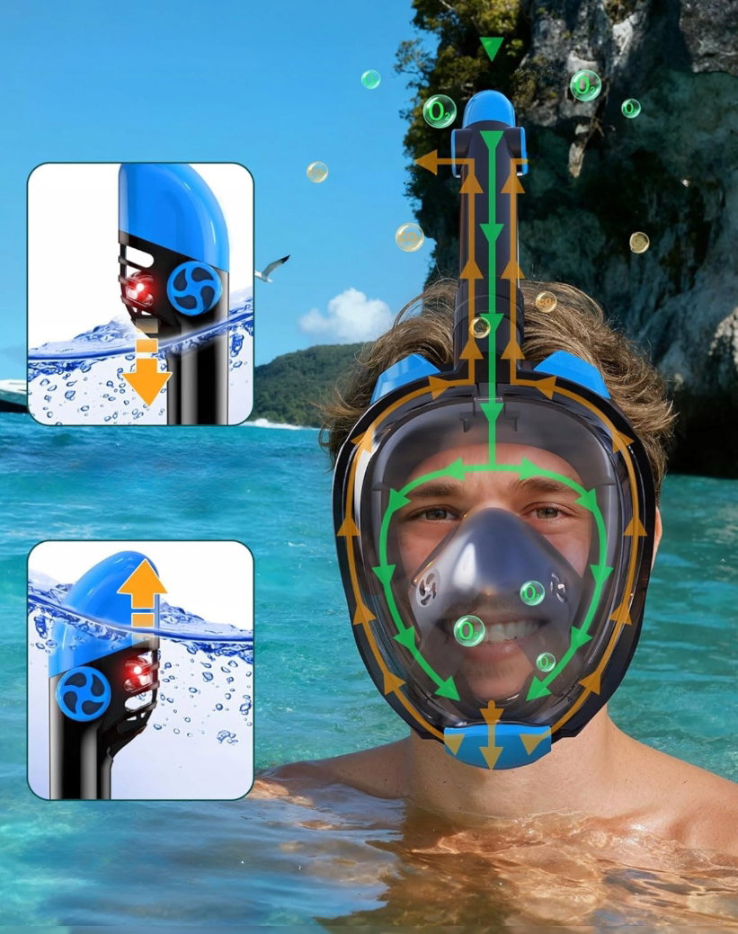 - Oddychanie i system przeciw parowaniu: zastosowano składany suchy wąż do oddychania z ulepszonym systemem ochrony dróg oddechowych. Dwukanałowe zawory wylotowe skutecznie odprowadzają wydychane powietrze, ograniczając parowanie soczewki i zapobiegając przedostawaniu się wody do wnętrza. Konstrukcja węża pozwala również na wygodne przechowywanie i transport.