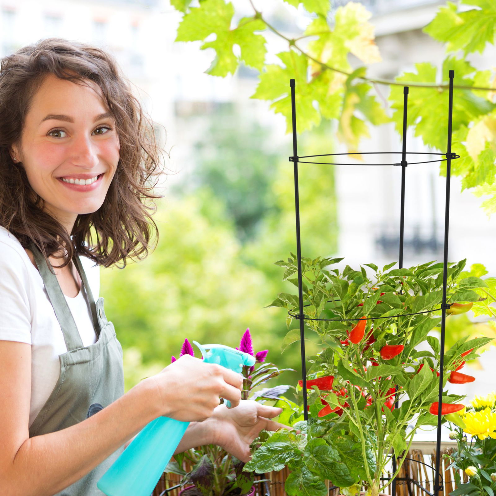Zapewnij swoim pnącym roślinom doniczkowym wsparcie i odpowiedni kształt dzięki zestawowi 2szt. podpórek wspinaczkowych dla małych roślin ozdobnych i użytkowych. Pergola wykonana z metalu i tworzywa sztucznego może być wykorzystywana na wiele sposobów - jako kolumna na pomidory koktajlowe na balkonie lub jako stojak dla palmy górskiej w salonie. Prosty montaż - wystarczy wbić w ziemię. Można zabezpieczyć rozłożyste pnącza lub podeprzeć delikatne rośliny pomidorów i papryki. Składana konstrukcja pergoli pierścieniowej nadaje się również do stosowania na grządkach ogrodowych.