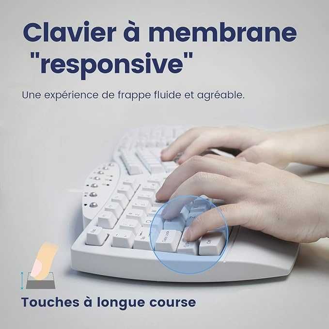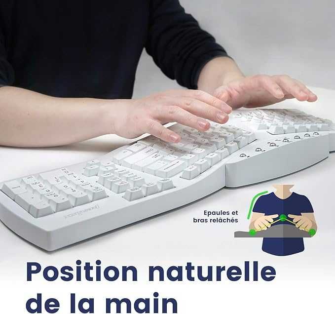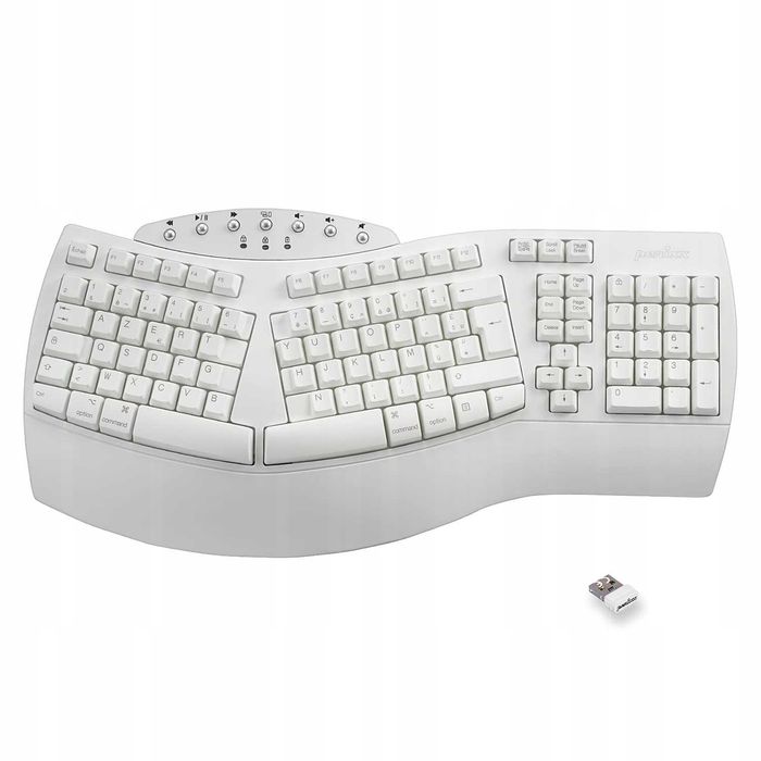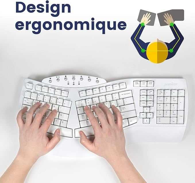 ERGONOMICZNA KONSTRUKCJA - Komfort i wydajność. z dwoma blokami i konstrukcja 3D zapobiegają wyginaniu nadgarstków na zewnątrz i pozwalają na naturalne ułożenie dłoni. Ta klawiatura jest zalecana dla użytkowników z zaburzeniami układu mięśniowo-szkieletowego. Może być konieczne trochę czasu, aby przyzwyczaić się do ergonomii klawiatury.