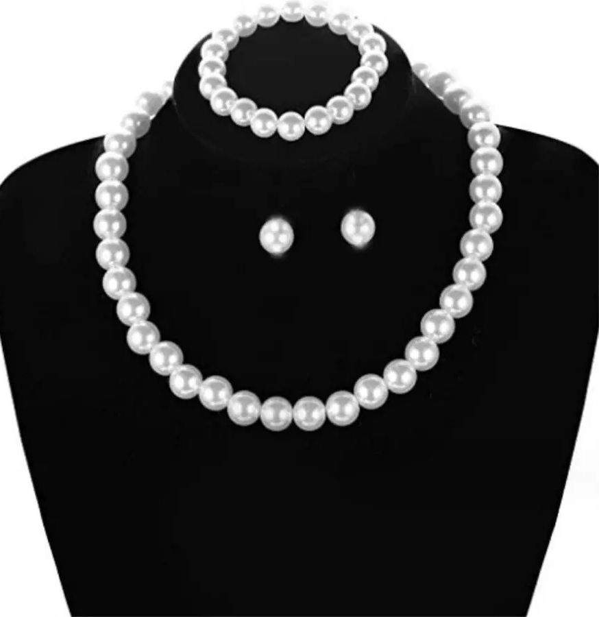 perłowy ZESTAW naszyjnik kolczyki i bransoleta na gumce klasyczny perłowy