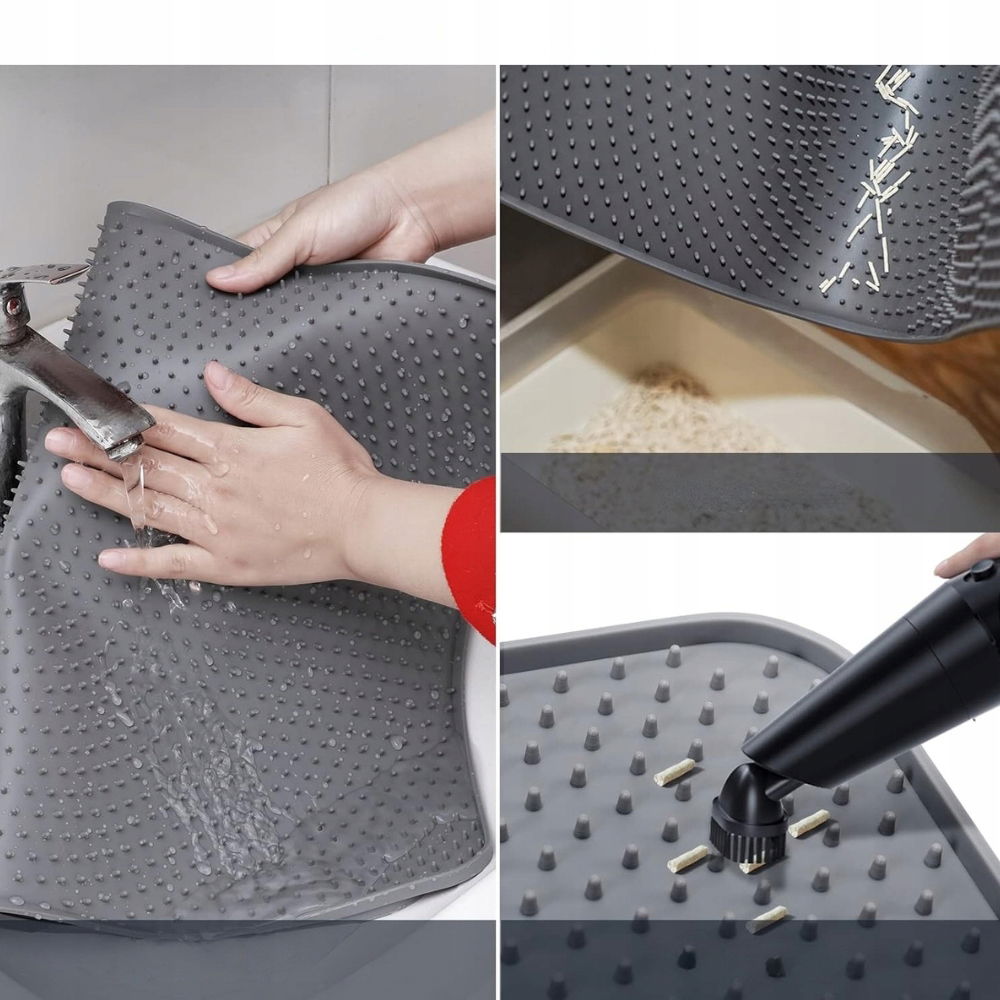 Dzięki specjalnej strukturze mata skutecznie wyłapuje żwirek wysypany z kuwety lub przyklejony do łapek. Wystarczy ją unieść, by zebrać rozsypany materiał i – jeśli chcesz – wsypać go z powrotem do kuwety. Oszczędność i wygoda w jednym!
