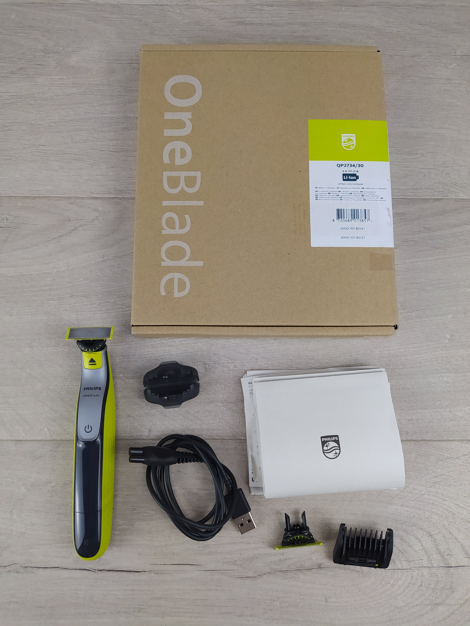 - Zestaw zawiera: 1x golarkę Philips OneBlade 360 Face, 1x regulowaną nasadkę grzebieniową 5 w 1 (1-5 mm), 1x dodatkowe ostrze wymienne 360, 1x nasadkę ochronną, 1x kabel do ładowania USB-A, instrukcję obsługi; Do ładowania produktu należy używać wyłącznie certyfikowanego adaptera USB ze wtyczką A i napięciem wyjściowym 5,1 A.