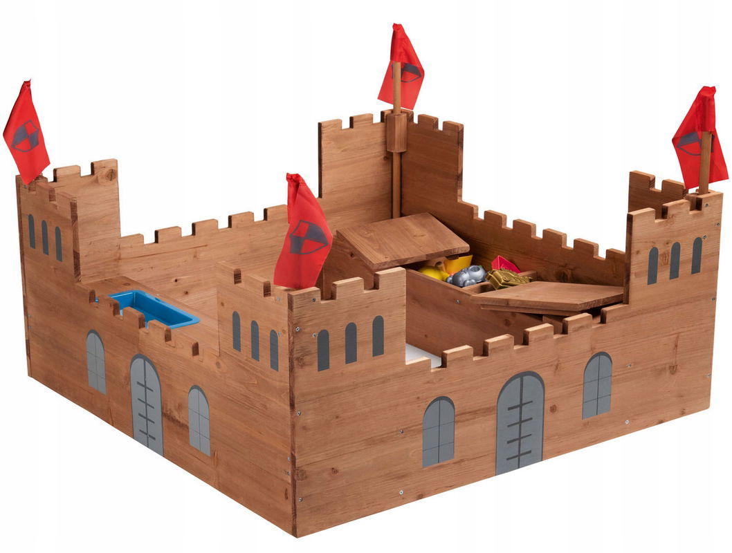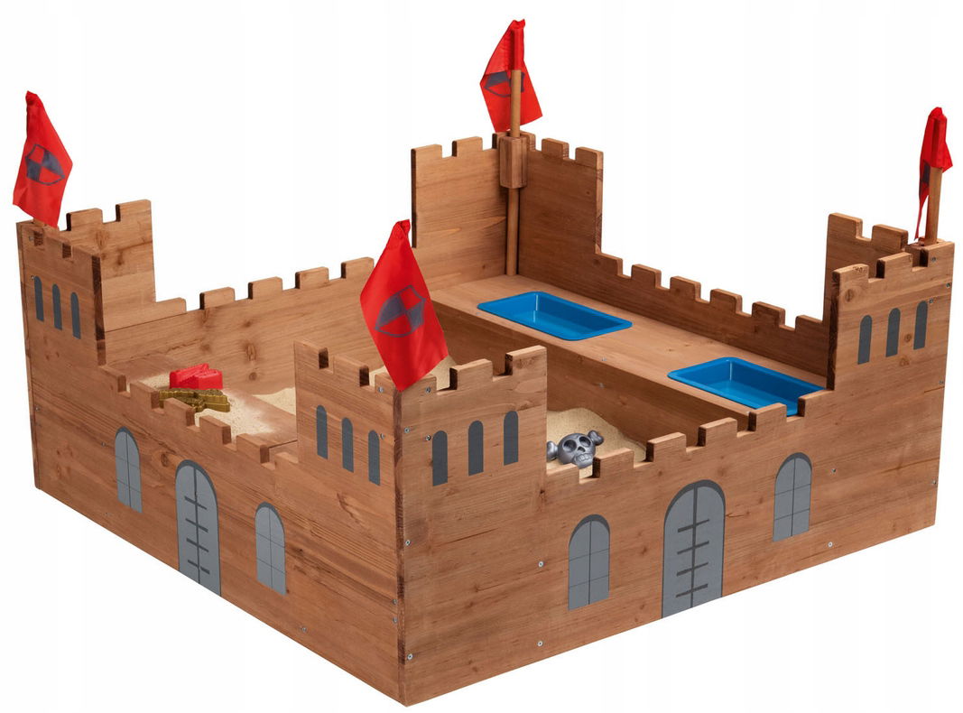✅piaskownica z miejscami do siedzenia, miejscem do przechowywania, zbiornikami na wodę i wieżami zamkowymi z flagami