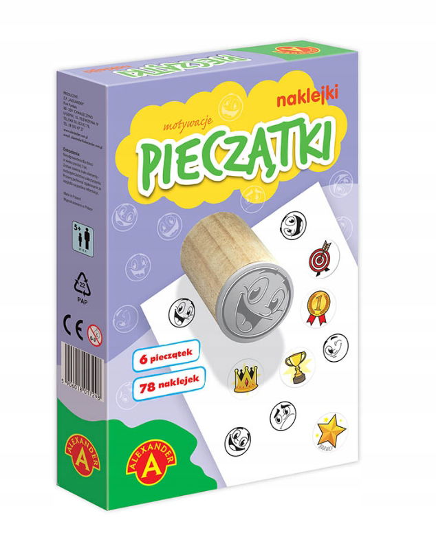 Zestaw kreatywny dla dzieci składający się z 6 pieczątek z wzorami buziek wyrażającymi poprzez mimikę i napisy uznanie lub dezaprobatę. Pieczątki można odbijać na kartce czarnym i czerwonym tuszem z poduszek znajdujących się w specjalnym, plastikowym pudełku.