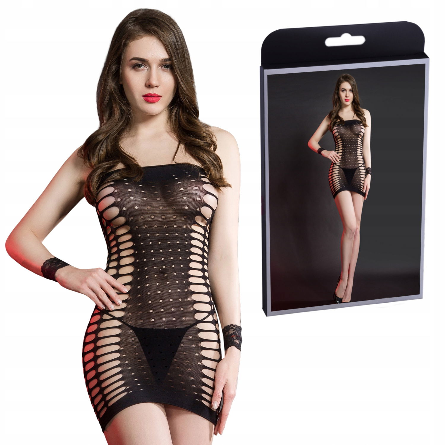 Piękna Halka Bielizna Damska Czarna Sukienka Mini w Kropki