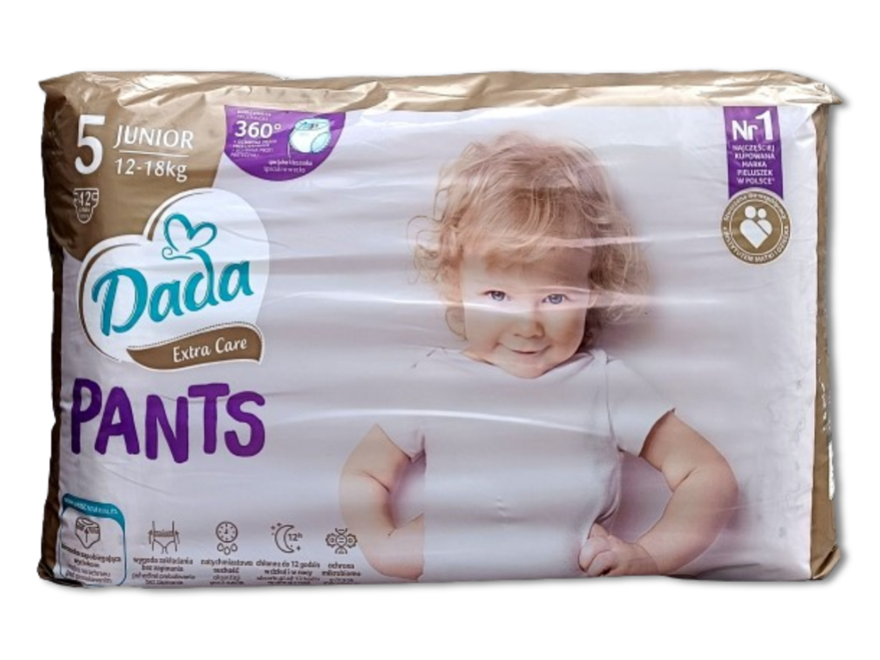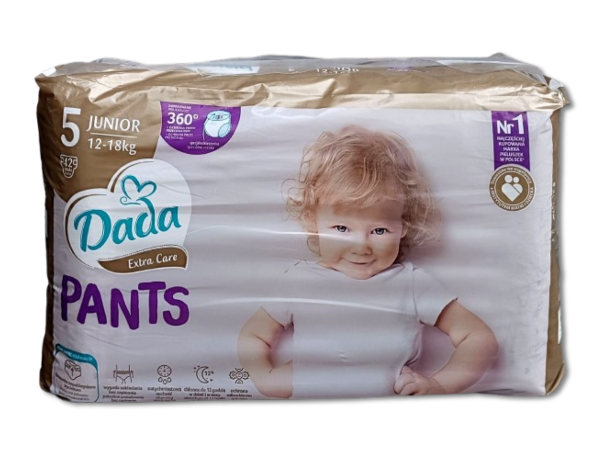 Jednorazowe pieluchomajtki Dada Extra Care 360 w rozmiarze 5, przeznaczone dla dzieci o wadze 12-18kg. Są to jedyne pieluchomajtki w Polsce stworzone we współpracy z Instytutem Matki i Dziecka z oddychających materiałów, zapewniające dziecku komfort (do 12 godzin suchości). Pieluchomajtki są miękkie, delikatne, dopasowane do ciała dziecka dzięki czemu zapewniają swobodę ruchów. W pieluchomajtkach zastosowano liczne technologie poprawiające komfort dziecka takie jak SeconDRY zapewniające natychmiastową suchość, Quick Liquid Attraction i super chłonne kanaliki zapewniające szybkie i równomierne wchłanianie i rozprowadzanie wilgoci wewnątrz pieluchomajtek oraz technologia LongLasting Wetlock, która zapewnia długotrwałą chłonność pieluchomajtek. Pieluchomajtki posiadają także kieszonkę zapobiegającą wyciekom oraz identyfikator wilgotności w przedniej części. Gdy pasek jest żółty pieluchomajtki są suche, zmiana koloru paska na niebiesko-zielony oznacza iż pieluchomajtki należy zmienić. Pieluchomajtki są wyprodukowane bez użycia chloru cząsteczkowego i nie zawierają kompozycji zapachowych (nie są perfumowane) w celu zminimalizowania ryzyka podrażnień i alergii. Produkt powstał w fabrykach wykorzystujących energię elektryczną pochodzącą ze źródeł odnawialnych, zaś celuloza do produkcji pieluchomajtek została pozyskana ze zrównoważonych upraw leśnych.