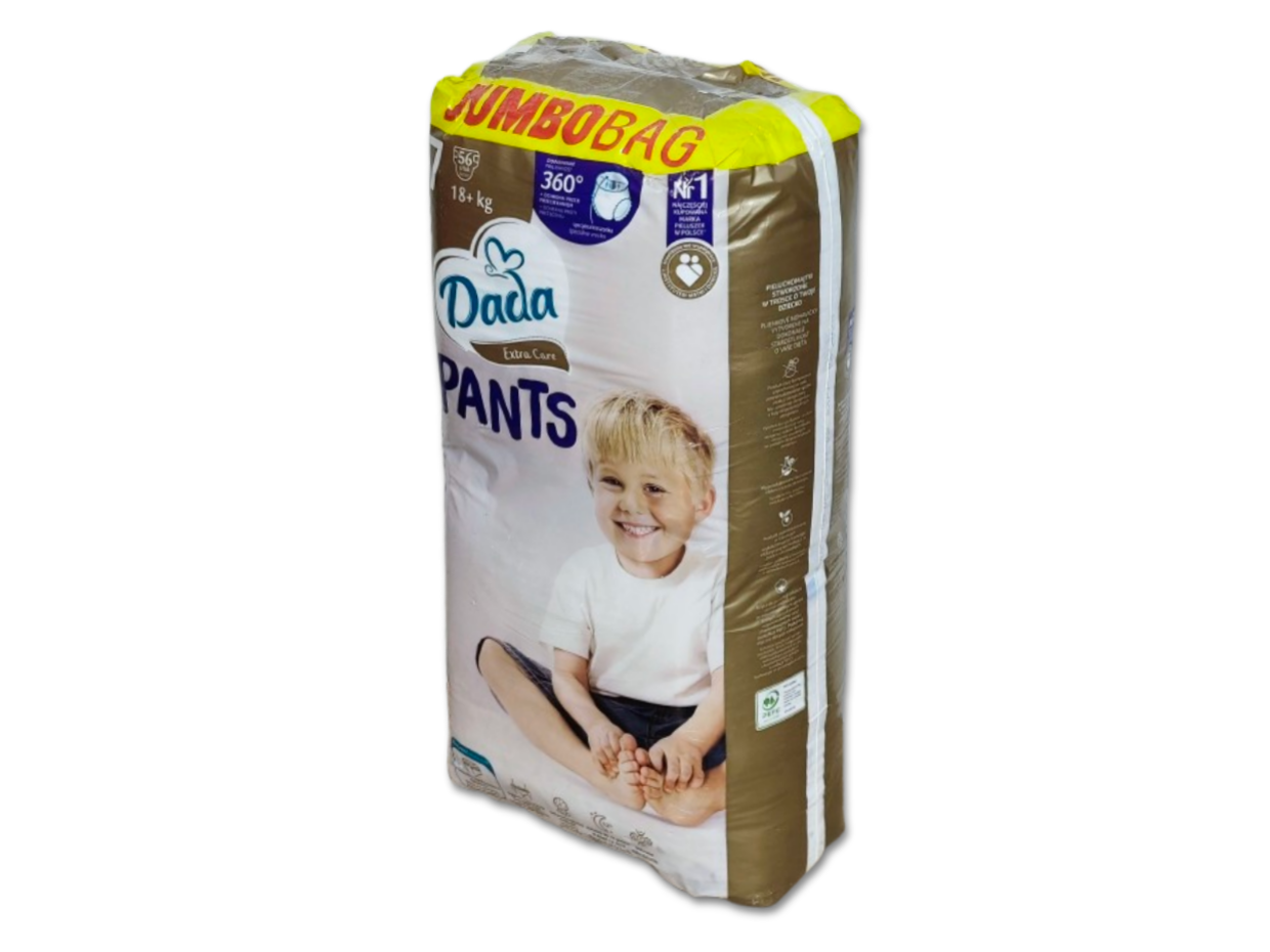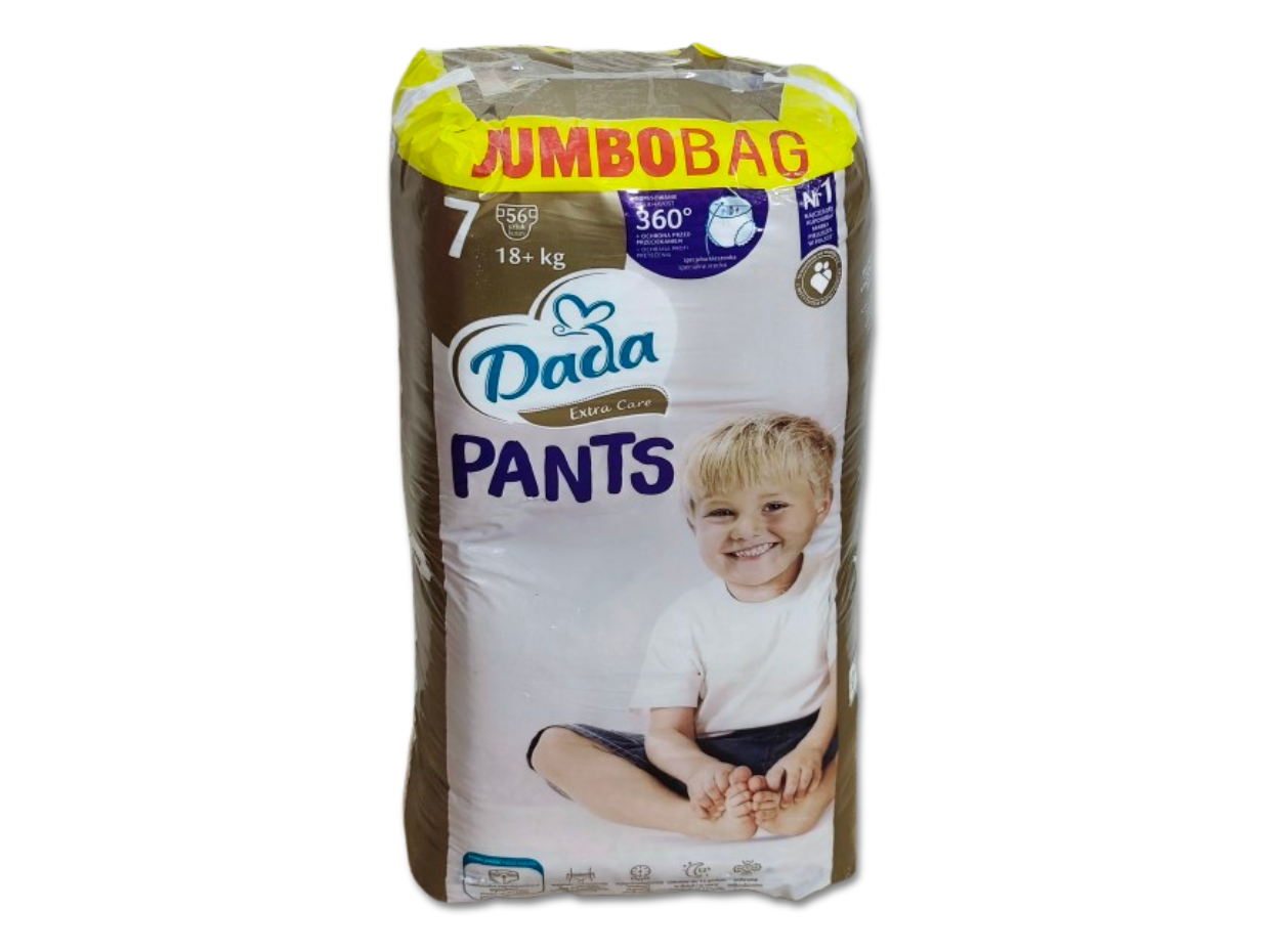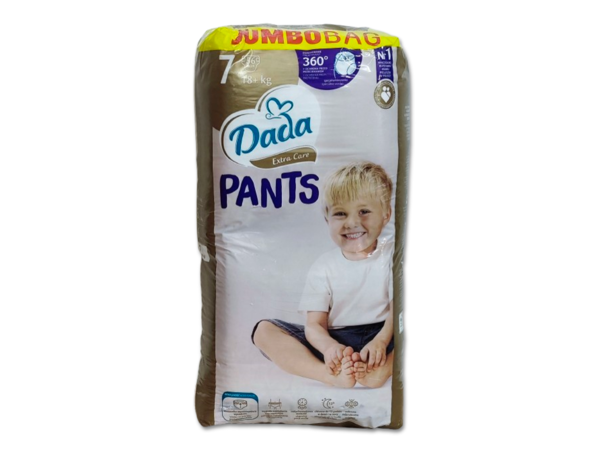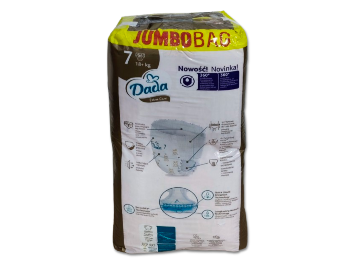 Jednorazowe pieluchomajtki Dada Extra Care 360 w rozmiarze 7, przeznaczone dla dzieci o wadze 18kg+. Są to jedyne pieluchomajtki w Polsce stworzone we współpracy z Instytutem Matki i Dziecka z oddychających materiałów, zapewniające dziecku komfort (do 12 godzin suchości). Pieluchomajtki są miękkie, delikatne, dopasowane do ciała dziecka dzięki czemu zapewniają swobodę ruchów. W pieluchomajtkach zastosowano liczne technologie poprawiające komfort dziecka takie jak SeconDRY zapewniające natychmiastową suchość, Quick Liquid Attraction i super chłonne kanaliki zapewniające szybkie i równomierne wchłanianie i rozprowadzanie wilgoci wewnątrz pieluchomajtek oraz technologia LongLasting Wetlock, która zapewnia długotrwałą chłonność pieluchomajtek. Pieluchomajtki posiadają także kieszonkę zapobiegającą wyciekom oraz identyfikator wilgotności w przedniej części. Gdy pasek jest żółty pieluchomajtki są suche, zmiana koloru paska na niebiesko-zielony oznacza iż pieluchomajtki należy zmienić. Pieluchomajtki są wyprodukowane bez użycia chloru cząsteczkowego i nie zawierają kompozycji zapachowych (nie są perfumowane) w celu zminimalizowania ryzyka podrażnień i alergii. Produkt powstał w fabrykach wykorzystujących energię elektryczną pochodzącą ze źródeł odnawialnych, zaś celuloza do produkcji pieluchomajtek została pozyskana ze zrównoważonych upraw leśnych.