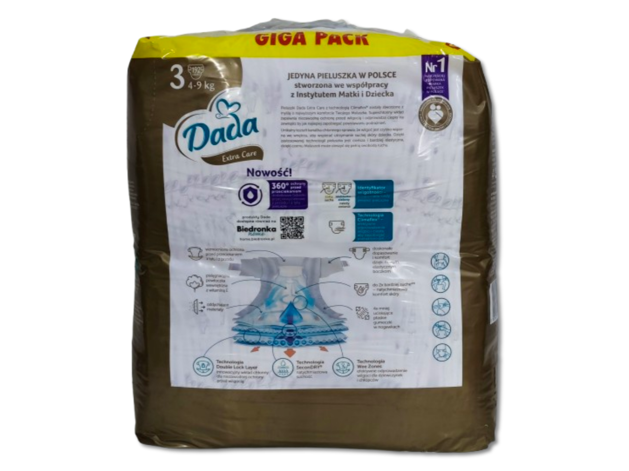 Jednorazowe pieluszki Dada Extra Care w rozmiarze 3, przeznaczone dla dzieci 4-9kg. Pieluszki stworzone we współpracy z instytutem matki i dziecka, zapewniają komfort (do 12h suchości), są delikatne, miękkie, chronią przed przecieraniem i posiadają elastyczne boczki, zapewniające swobodę ruchów. Nowa formuła zapewnia do 2x szybsze wchłanianie, dzięki zastosowaniu super chłonnych kanalików w technologii Flowlock. Dzięki technologi Climaflex pieluszki efektywnie odprowadzają wilgoć i ciepło zapobiegając podrażnieniom, Pieluszki posiadają szerokie zapięcia ułatwiające ich zmianę. Anatomiczny kształt zapewnia lepsze dopasowanie, a miękka warstwa wewnętrzna (z powłoczką z witaminą E) zapewnia miękkość, delikatność i przewiewność. Pieluszki posiadają również specjalne płaskie gumeczki w nogawkach, które cztery razy lżej uciskają na skórę dziecka niż standardowe okrągłe gumki. Pieluszki nie są perfumowane co zmniejsza ryzyko podrażnień i alergii. Każda pieluszka posiada również identyfikator wilgotności, który zmienia kolor gdy pieluszka jest wilgotna, który podpowiada, kiedy należy zmienić pieluszkę. Opakowanie zawiera 192 pieluszki. Pieluszki posiadają pozytywną opinię Instytutu Matki i Dziecka.