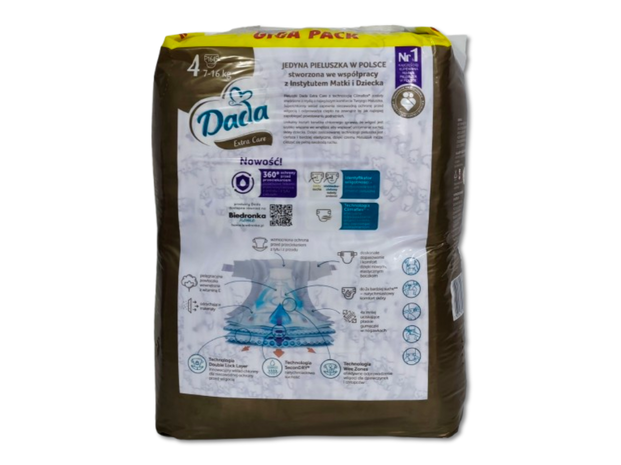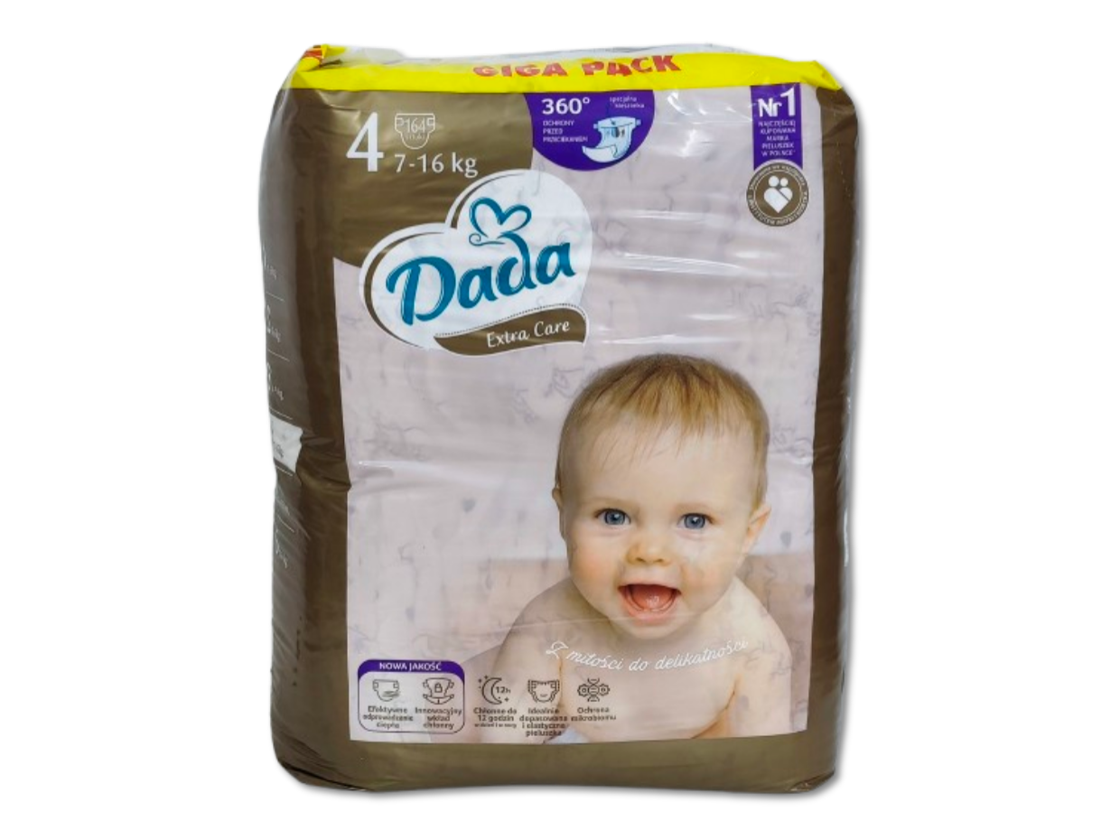 Jednorazowe pieluszki Dada Extra Care w rozmiarze 4, przeznaczone dla dzieci o wadze 7-16kg. Pieluszki stworzone we współpracy z instytutem matki i dziecka, zapewniają komfort (do 12h suchości), są delikatne, miękkie, chronią przed przecieraniem i posiadają elastyczne boczki, zapewniające swobodę ruchów. Dzięki technologi Climaflex pieluszki efektywnie odprowadzają wilgoć i ciepło zapobiegając podrażnieniom. Pieluszki posiadają szerokie zapięcia ułatwiające ich zmianę. Anatomiczny kształt zapewnia lepsze dopasowanie, a miękka warstwa wewnętrzna (z powłoczką z witaminą E) zapewnia miękkość, delikatność i przewiewność. Pieluszki posiadają również specjalne płaskie gumeczki w nogawkach, które cztery razy lżej uciskają na skórę dziecka niż standardowe okrągłe gumki. Pieluszki nie są perfumowane co zmniejsza ryzyko podrażnień i alergii. Każda pieluszka posiada również identyfikator wilgotności, zmieniający kolor gdy pieluszka jest wilgotna, który podpowiada, kiedy należy zmienić pieluszkę. Opakowanie zawiera 164 pieluszki. Pieluszki posiadają pozytywną opinię Instytutu Matki i Dziecka.