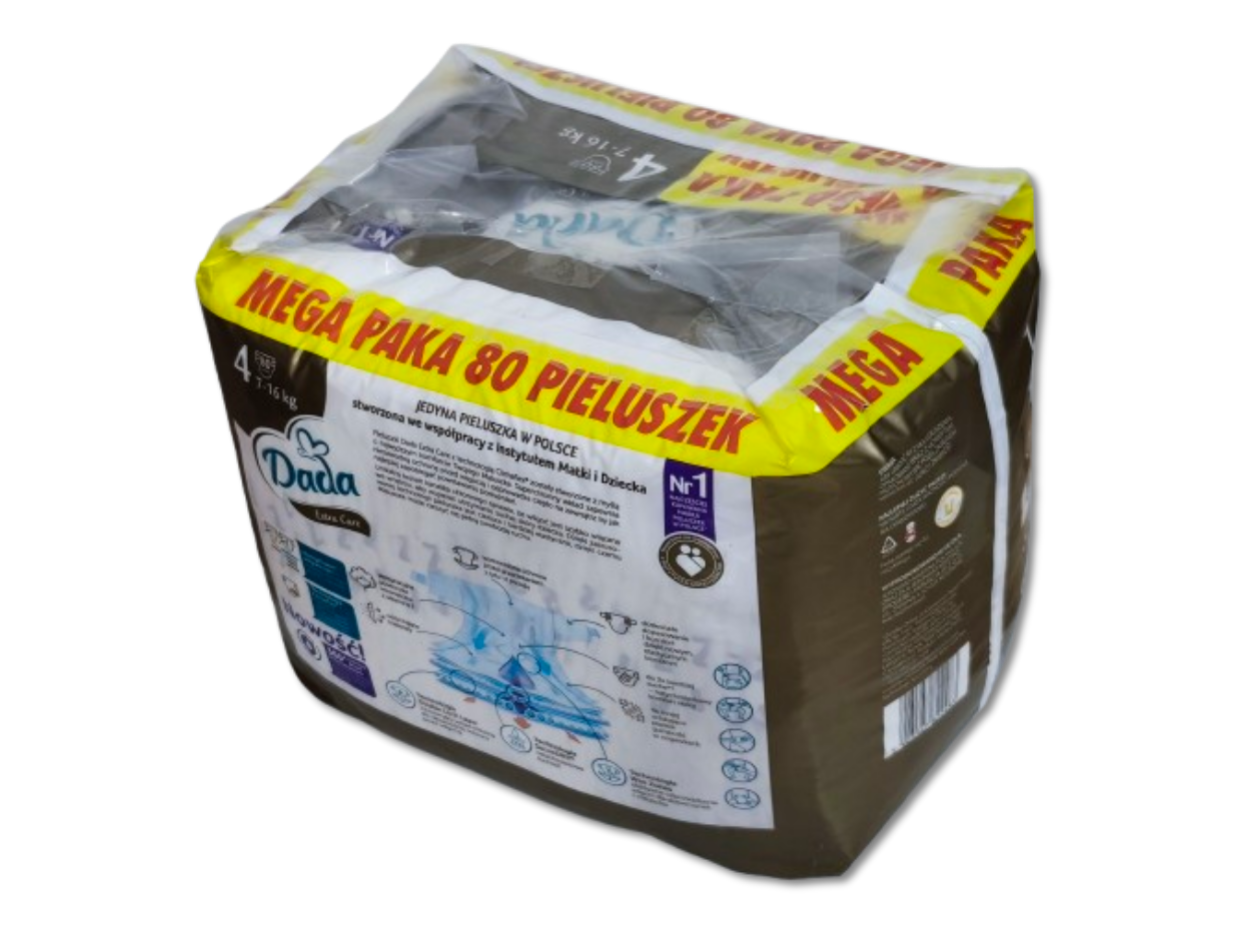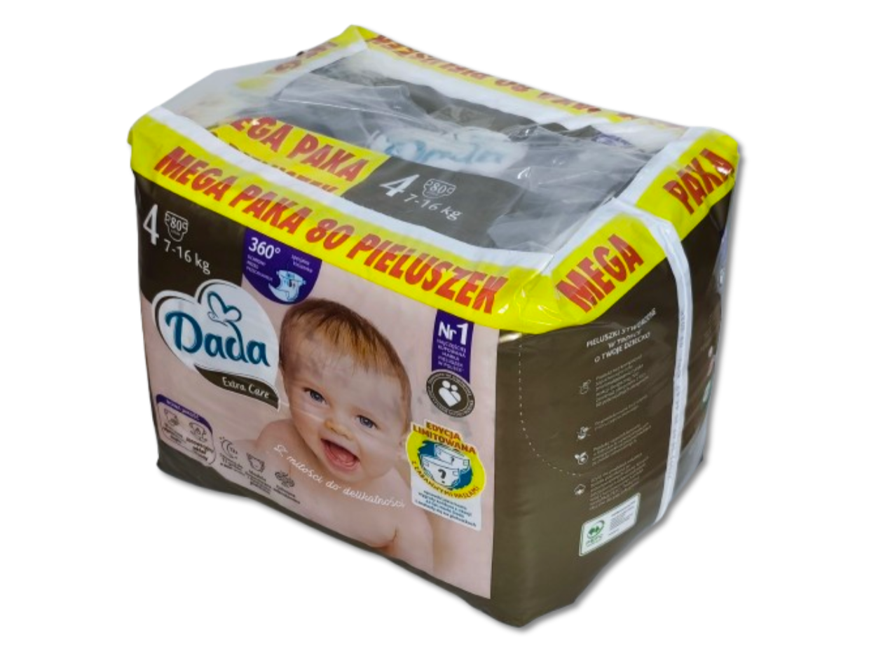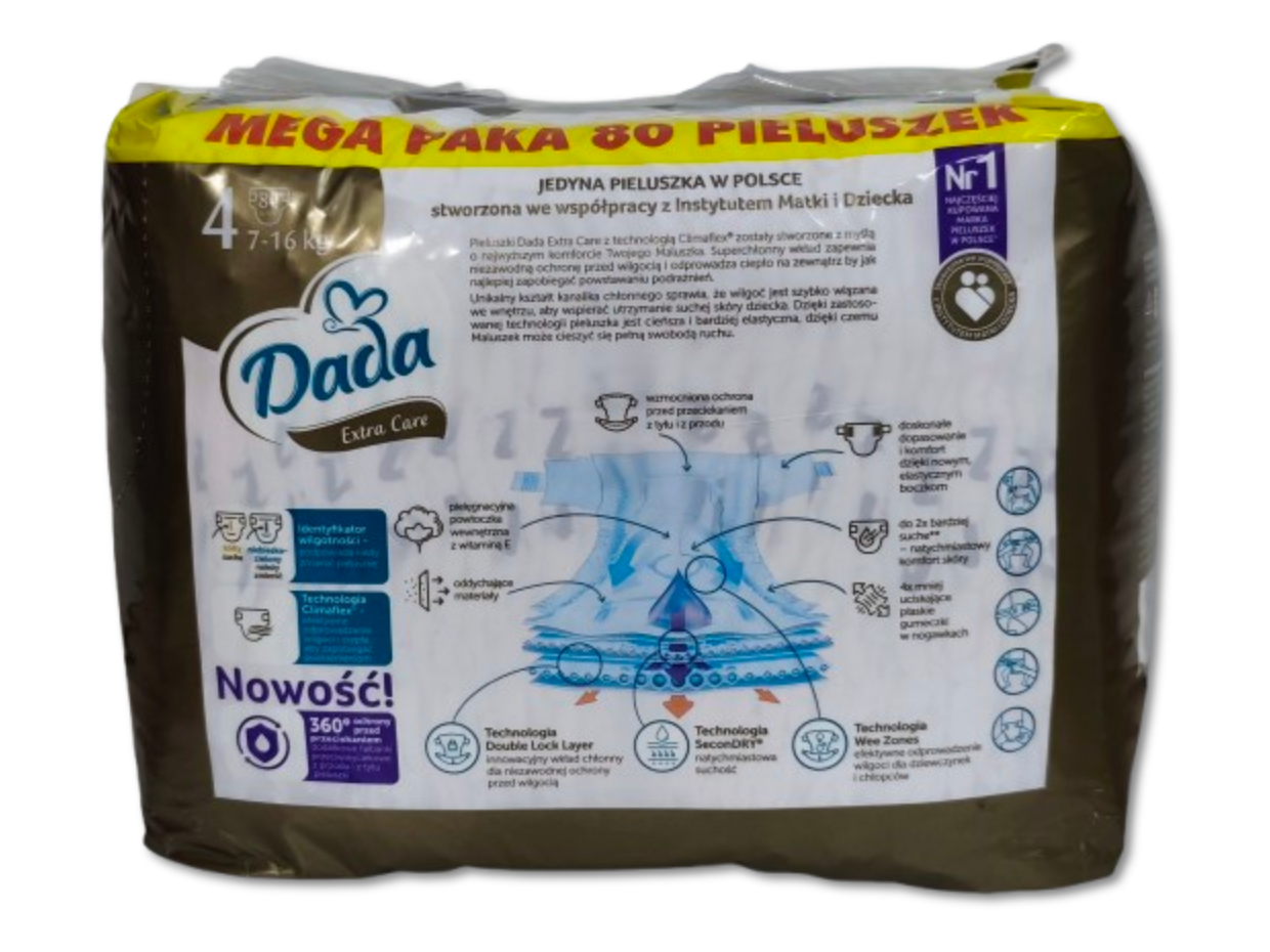 Jednorazowe pieluszki Dada Extra Care w rozmiarze 4, przeznaczone dla dzieci o wadze 7-16kg. Pieluszki stworzone we współpracy z instytutem matki i dziecka, zapewniają komfort (do 12h suchości), są delikatne, miękkie, chronią przed przecieraniem i posiadają elastyczne boczki, zapewniające swobodę ruchów. Dzięki technologi Climaflex pieluszki efektywnie odprowadzają wilgoć i ciepło zapobiegając podrażnieniom. Pieluszki posiadają szerokie zapięcia ułatwiające ich zmianę. Anatomiczny kształt zapewnia lepsze dopasowanie, a miękka warstwa wewnętrzna (z powłoczką z witaminą E) zapewnia miękkość, delikatność i przewiewność. Pieluszki posiadają również specjalne płaskie gumeczki w nogawkach, które cztery razy lżej uciskają na skórę dziecka niż standardowe okrągłe gumki. Pieluszki nie są perfumowane co zmniejsza ryzyko podrażnień i alergii. Każda pieluszka posiada również identyfikator wilgotności, zmieniający kolor gdy pieluszka jest wilgotna, który podpowiada, kiedy należy zmienić pieluszkę. Opakowanie zawiera 80 pieluszek. Pieluszki posiadają pozytywną opinię Instytutu Matki i Dziecka. Limitowana edycja pieluszek z zabawnymi hasłami na pieluszkach.